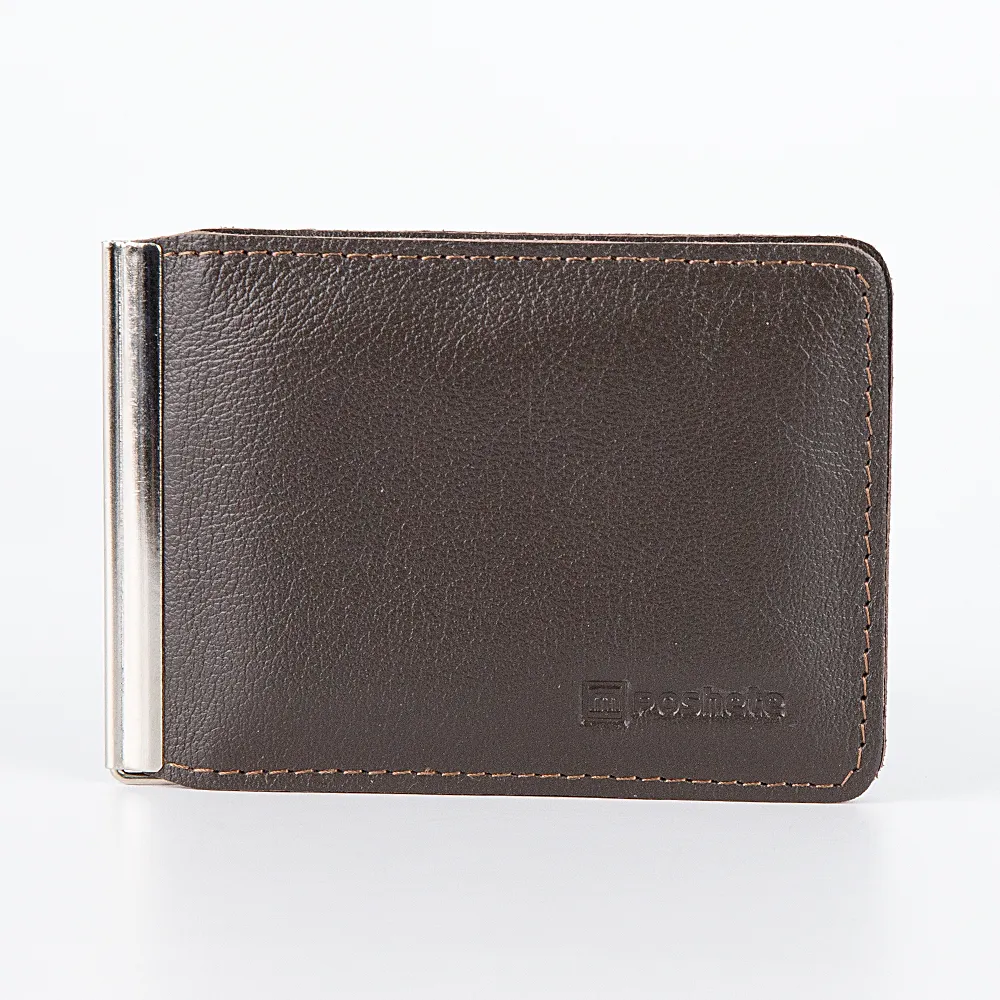Классический зажим для денег от Poshete выполнен в темно-коричневом цвете из натурально кожи с естественной фактурой и дополнен серебристой металлической фурнитурой. Модель имеет отдельный карман для монет на кнопке.