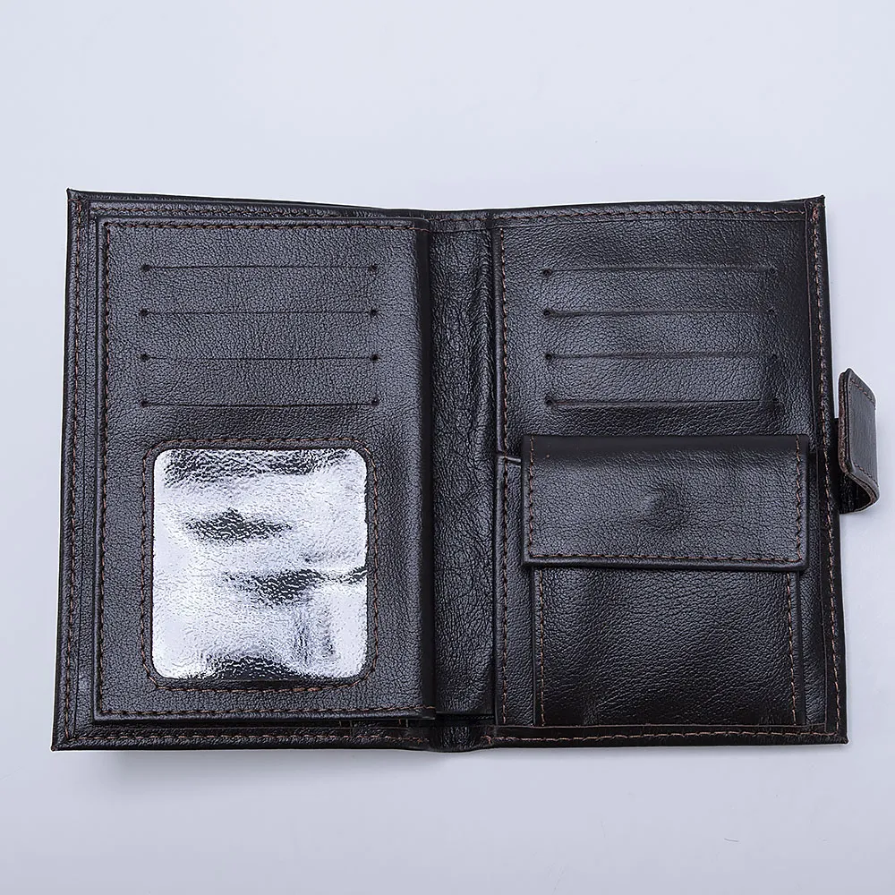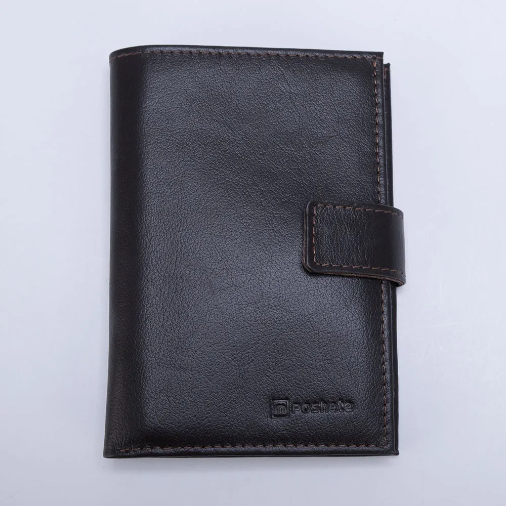 Бумажник от торговой марки Poshete из натуральной зернистой кожи коричневого цвета. Закрывается хлястиком на кнопке; раскрывается книжкой. Внутри: глубокое отделение для документов, карманы для карт, перегородка с двумя прозрачными карманами; имеется карман для монет с клапаном на кнопке.
