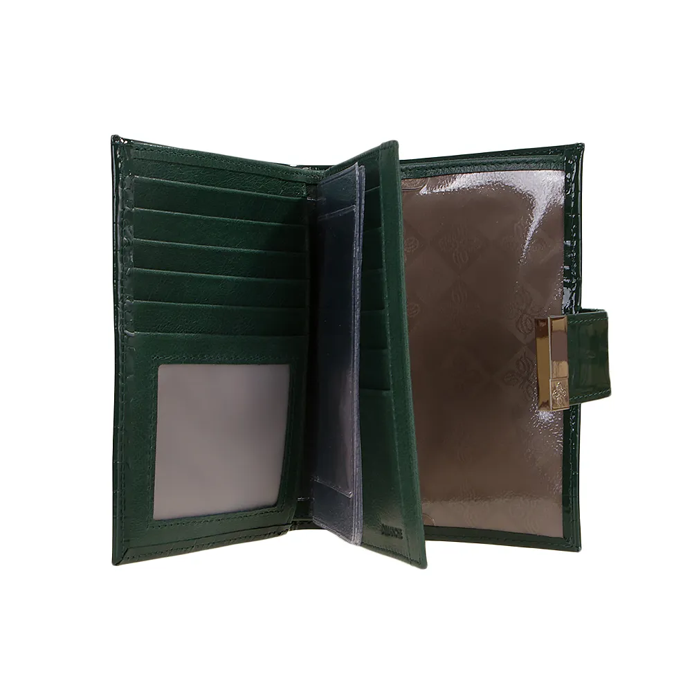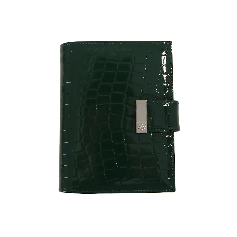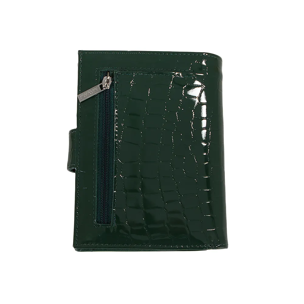 Бумажник от торговой марки Dimanche из натуральной кожи зеленого цвета с тиснением под крокодиловую кожу и декором. Модель вертикальной ориентации закрывается хлястиком на кнопку. Внутри: клапаны для паспорта, отделения для купюр, карманы для карт, карман-окошко, обложки для документов из прозрачного пластика, карман для сим-карты. На задней стороне – карман на молнии для монет.