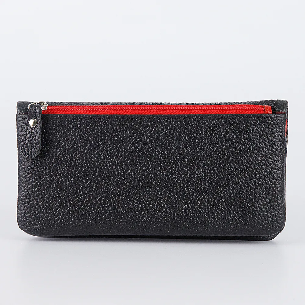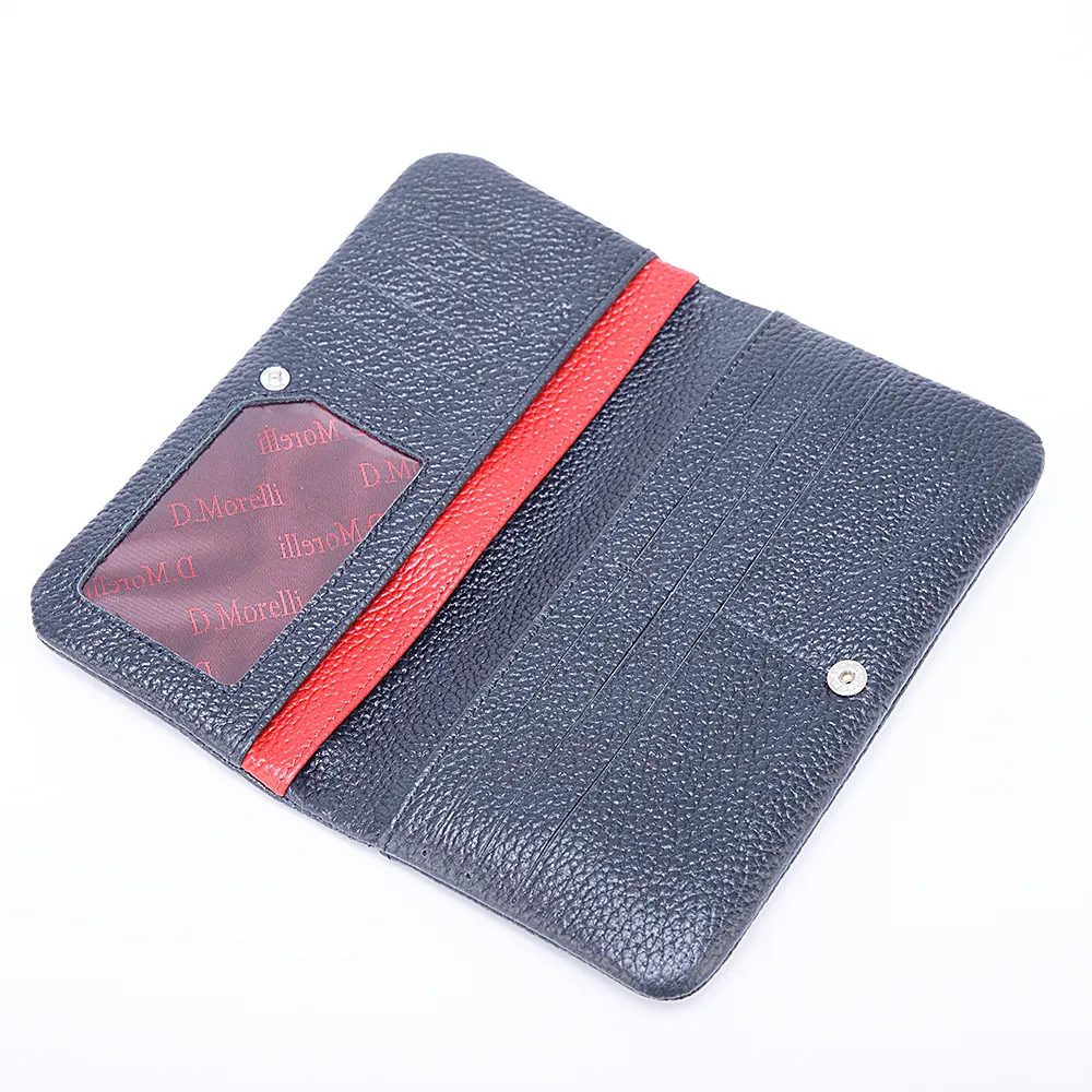 Кошелек коллекции «Бриенна» от торговой марки Domenico Morelli изготовлен из натуральной кожи черного цвета с яркими деталями красного цвета. Модель раскрывается книжкой, фиксируется кнопкой. Внутри: отделения для купюр, карманы для карт, карман-окошко. На задней стороне – карман на молнии.