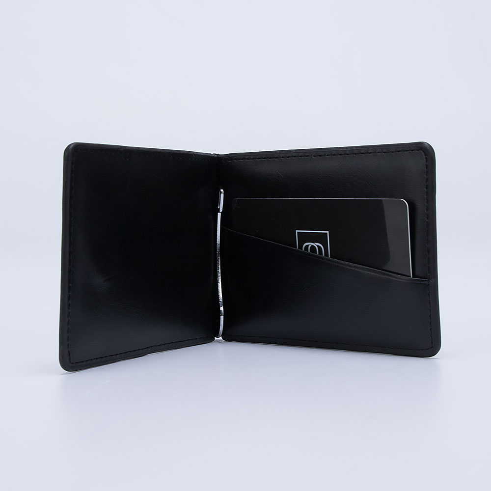 Зажим для денег Poshete чёрного цвета, выполнен из искусственной кожи. Внутри по центру металлический зажим, справа накладной карман без застёжки, подходит для пластиковых карт. Снаружи карман на молнии для монет. Зажим складывается пополам, раскрывается книжкой, без застёжки.