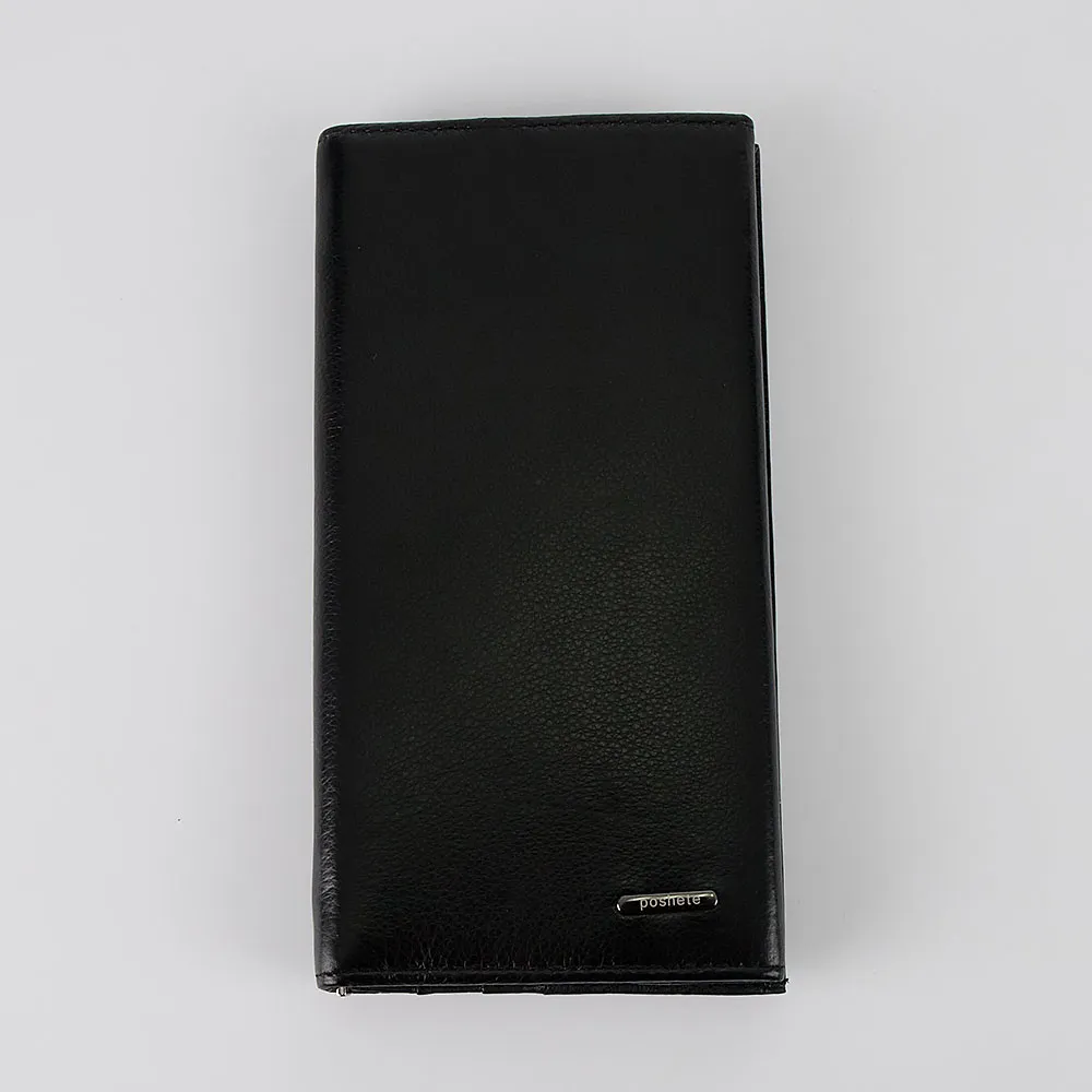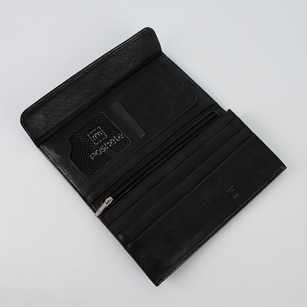Универсальный кошелёк от бренда Poshete стильный и удобный в использовании благодаря фиксации на магниты, с отличным качеством отделки. Раскрывается книжкой, внутри отделения для купюр с текстильной подкладкой, карман на молнии, двенадцать кармашков для карточек и кармашек-окошко. Выполнен из натуральной кожи в чёрном цвете.
