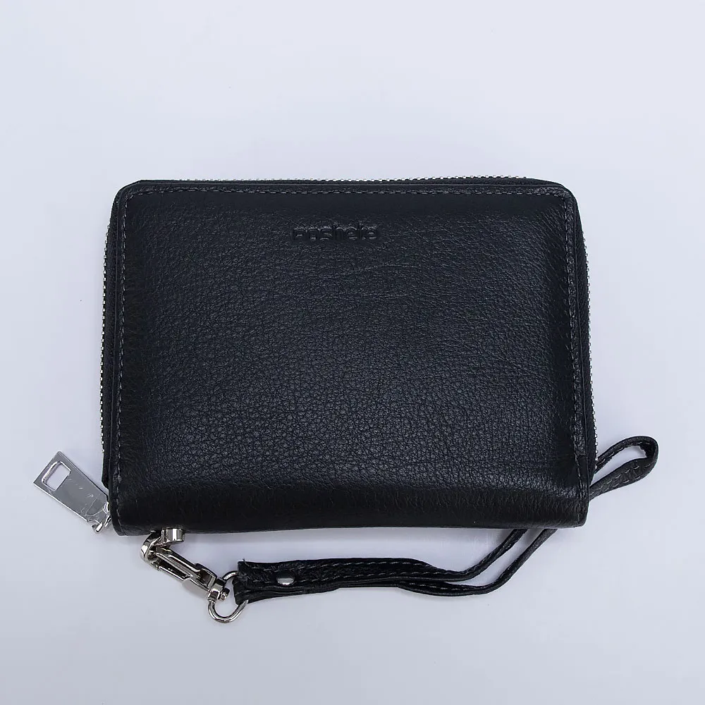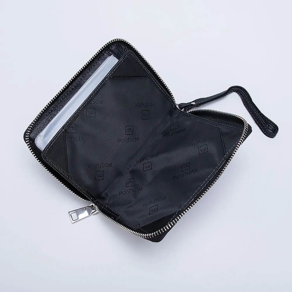 Бумажник от бренда Poshete выполнен из натуральной кожи черного цвета. Модель на молнии, со съемным ремешком для запястья. Внутри: файлы для документов, карманы для карт и сим-карт, карман-окошко. На задней стороне – карман на молнии. Передняя сторона декорирована тиснением с названием бренда.