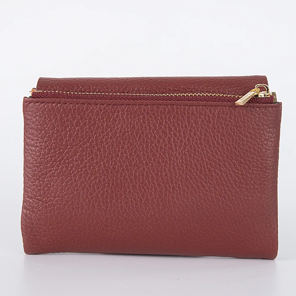 Оригинальный стильный кошелек от торговой марки Poshete изготовлен из натуральной кожи бордового цвета. Закрывается клапаном на скрытых магнитах. Модель с одним сложением. Внутри: отделение для купюр, карманы для карт, выполненные из кожи разного цвета, карман-окошко с сеточкой. Снаружи – отделение для монет на молнии.