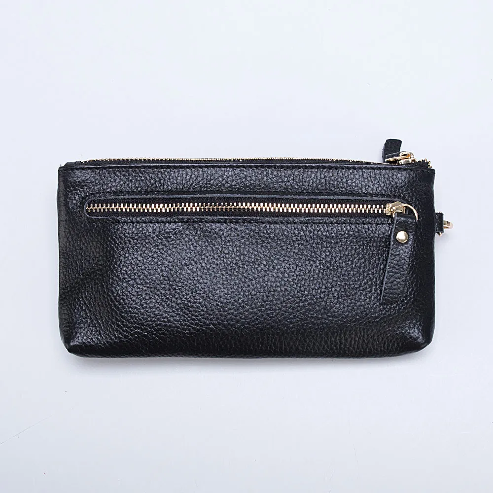 Стильный полноразмерный кошелек от бренда Poshete изготовлен из натуральной кожи черного цвета. Модель с двумя отделениями на молнии, с текстильной подкладкой. На лицевой стороне – прорезной карман на молнии. Кошелек можно носить как в сумке, так и в руке: в комплекте имеется съемный ремешок на запястье. Молнии удобно расстегивать благодаря кожаным пуллерам.