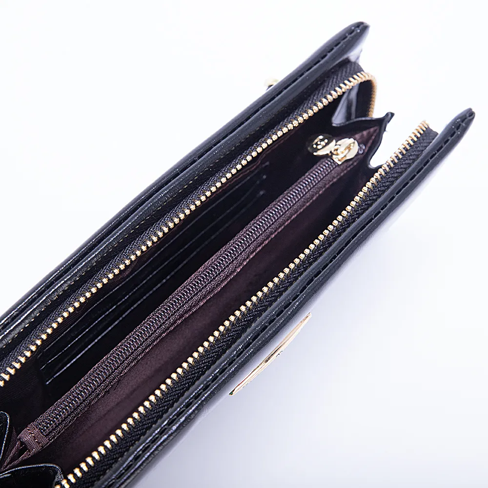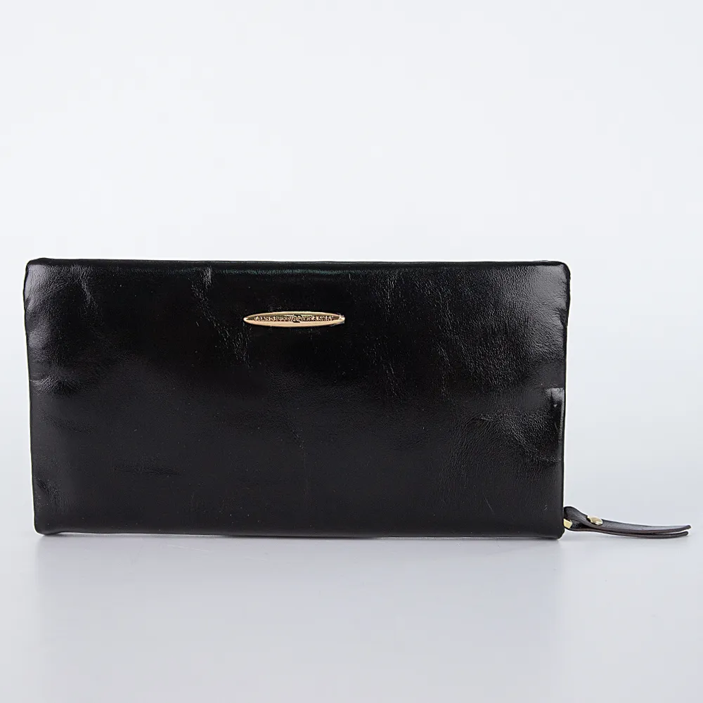 Большой женский кошелёк в ретро стиле от бренда Francesco Molinary выполнен из натуральной кожи в сочетании с золотистой металлической фурнитурой и несомненно украсит вашу сумочку. Модель чёрного цвета с эффектом помятости и лоска. Закрывается на молнию, внутри четыре отсека для купюр, средник на молнии, шесть кармашков для карточек и один кармашек-окошко. Снаружи карман на молнии для монет.
