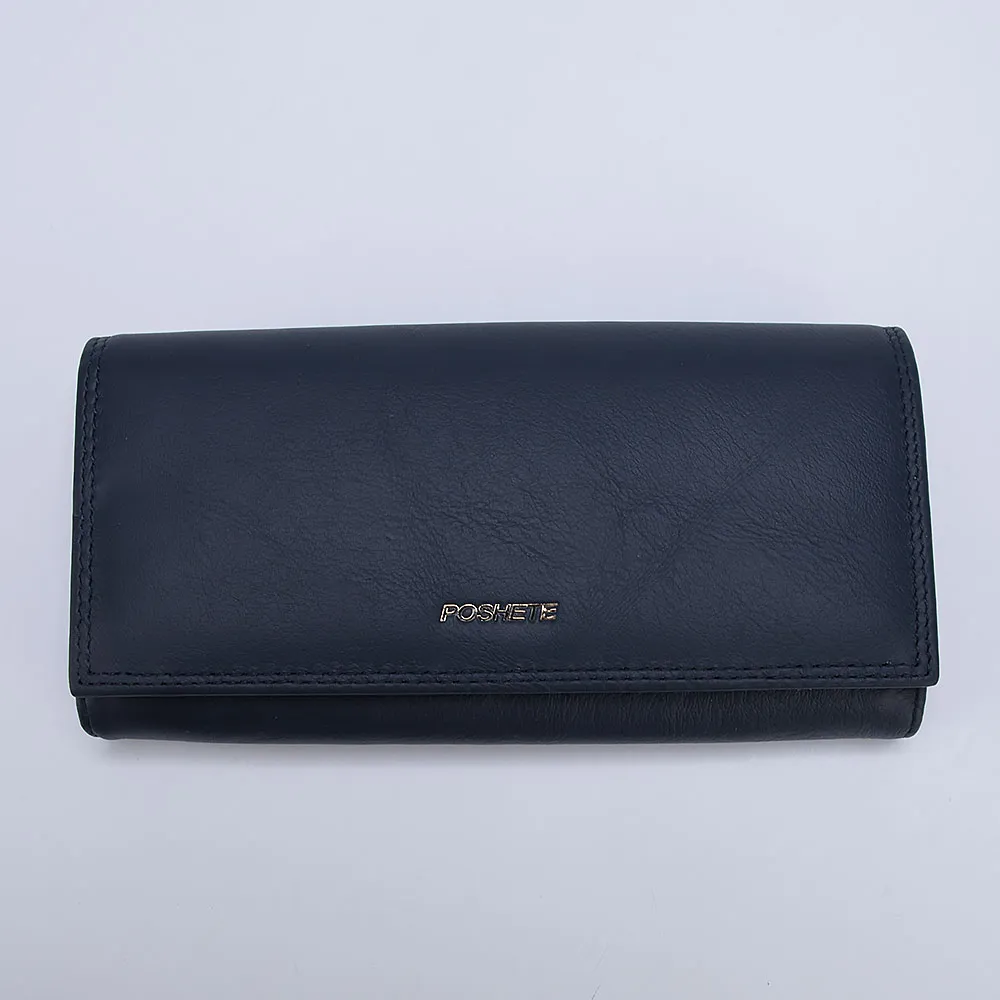 Классический женский кошелёк от Poshete выполнен в синем цвете из натуральной кожи с текстильной подкладкой. Кошелёк большой, купюры не придётся складывать. Закрывается клапаном на скрытые магниты. Внутри три отделения для купюр, карман на молнии, кармашки для пластиковых карт и отделение на замке-поцелуйчике для монет.