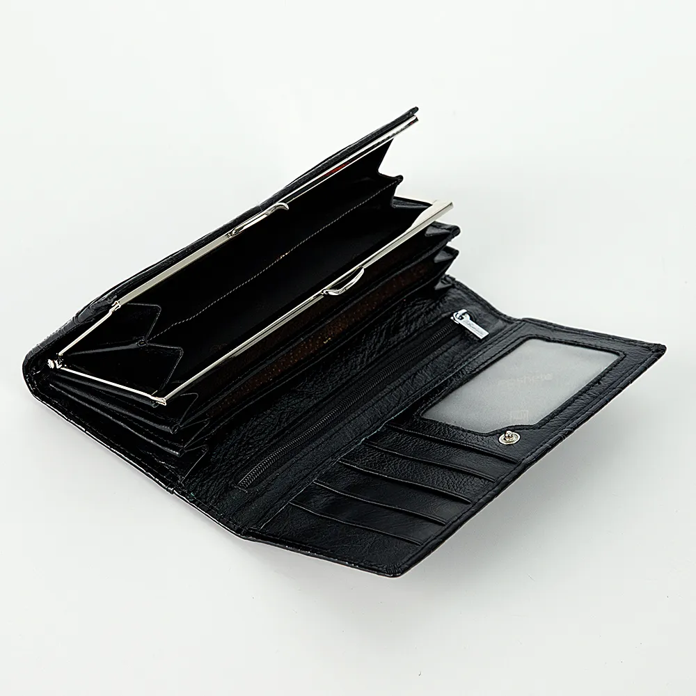 Оригинальный полноразмерный кошелек от бренда Poshete выполнен из натуральной кожи черного цвета. Рельефная текстура с цветами и бабочками придает аксессуару особый шарм. Модель закрывается на кнопку. Внутри: три отделения для купюр, карманы для карт, карман-окошко, карман на молнии. Имеется монетница на рамочном замке «поцелуйчике».