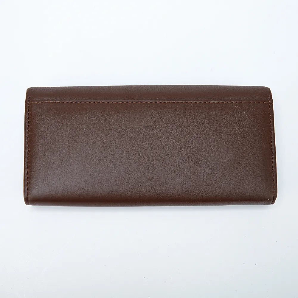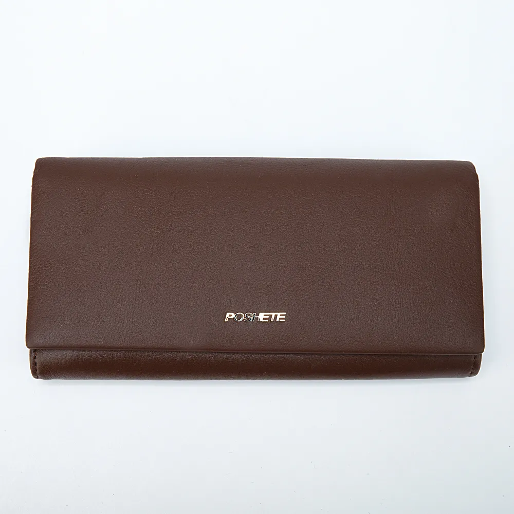 Классический большой кошелёк от бренда Poshete выполнен из натуральной кожи. Модель тёмно-коричневого цвета с золотистой фурнитурой. Фиксируется клапаном на магниты, внутри три отделения для купюр, карман на молнии, четыре кармашка для карточек и отделение на замке поцелуйчике для монет.