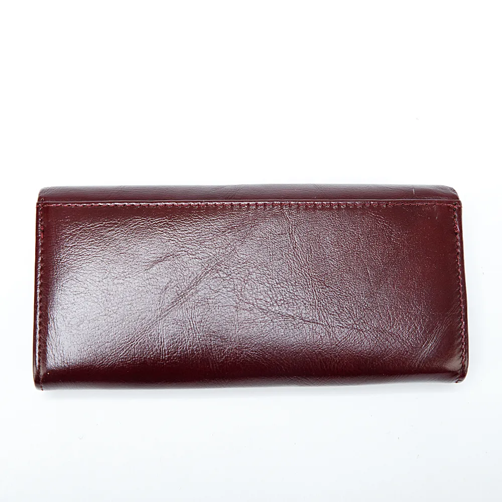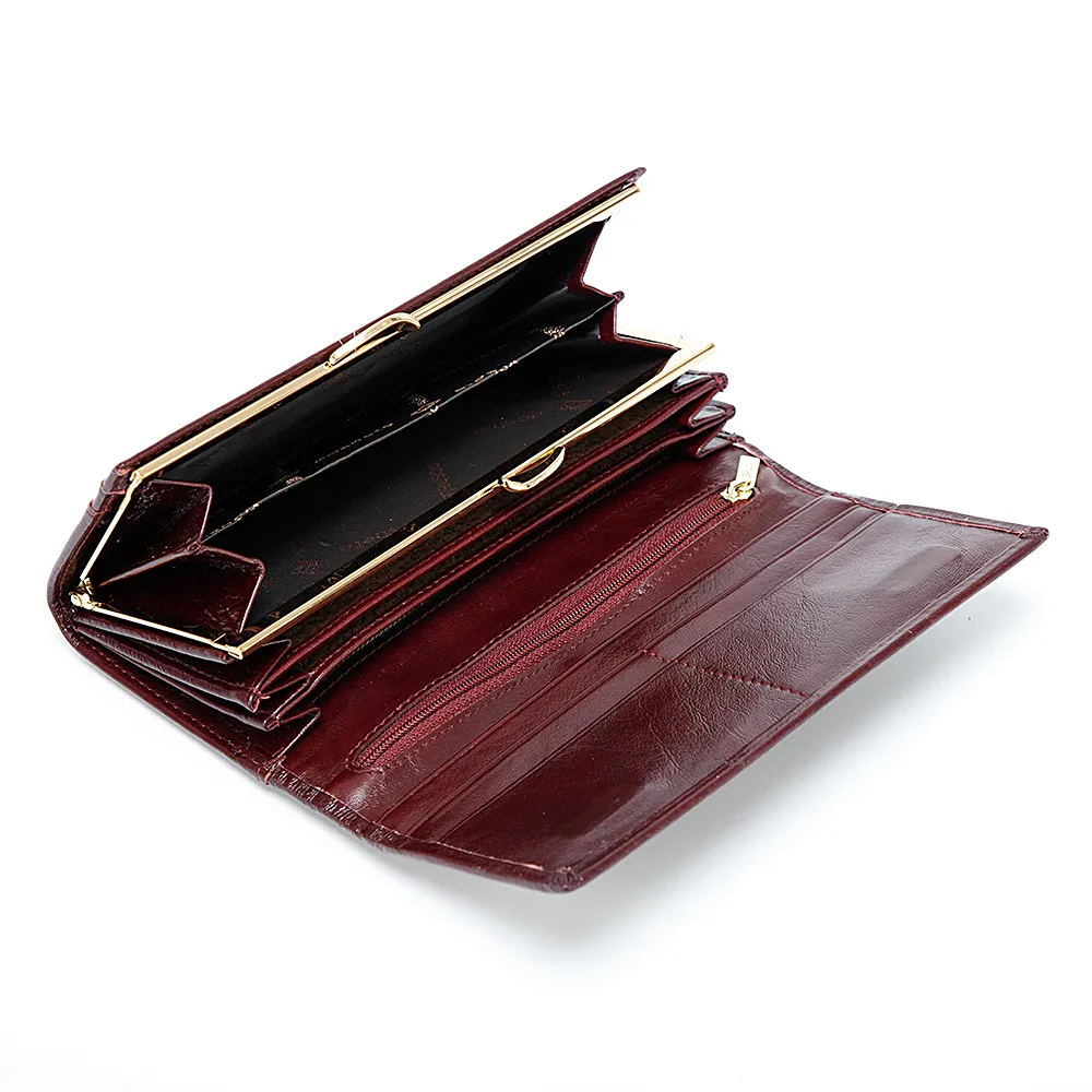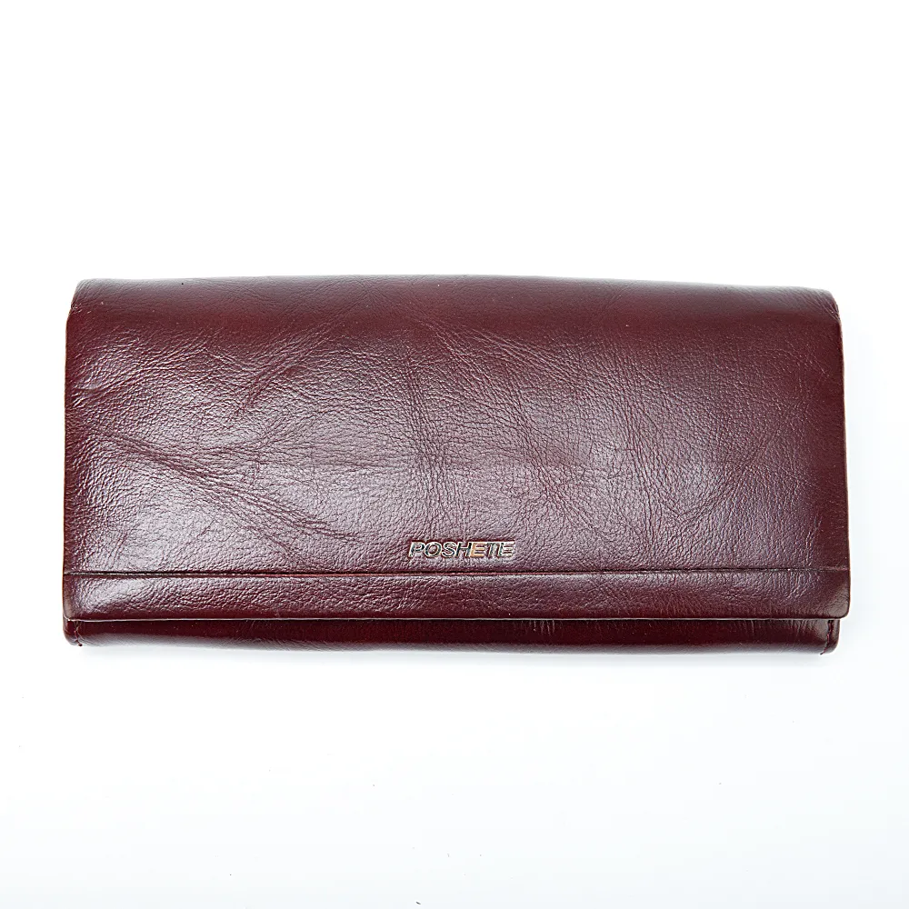 Классический большой кошелёк от бренда Poshete выполнен из натуральной кожи. Модель бордового цвета с золотистой фурнитурой. Фиксируется клапаном на магниты, внутри три отделения для купюр, карман на молнии, четыре кармашка для карточек и отделение на замке поцелуйчике для монет.