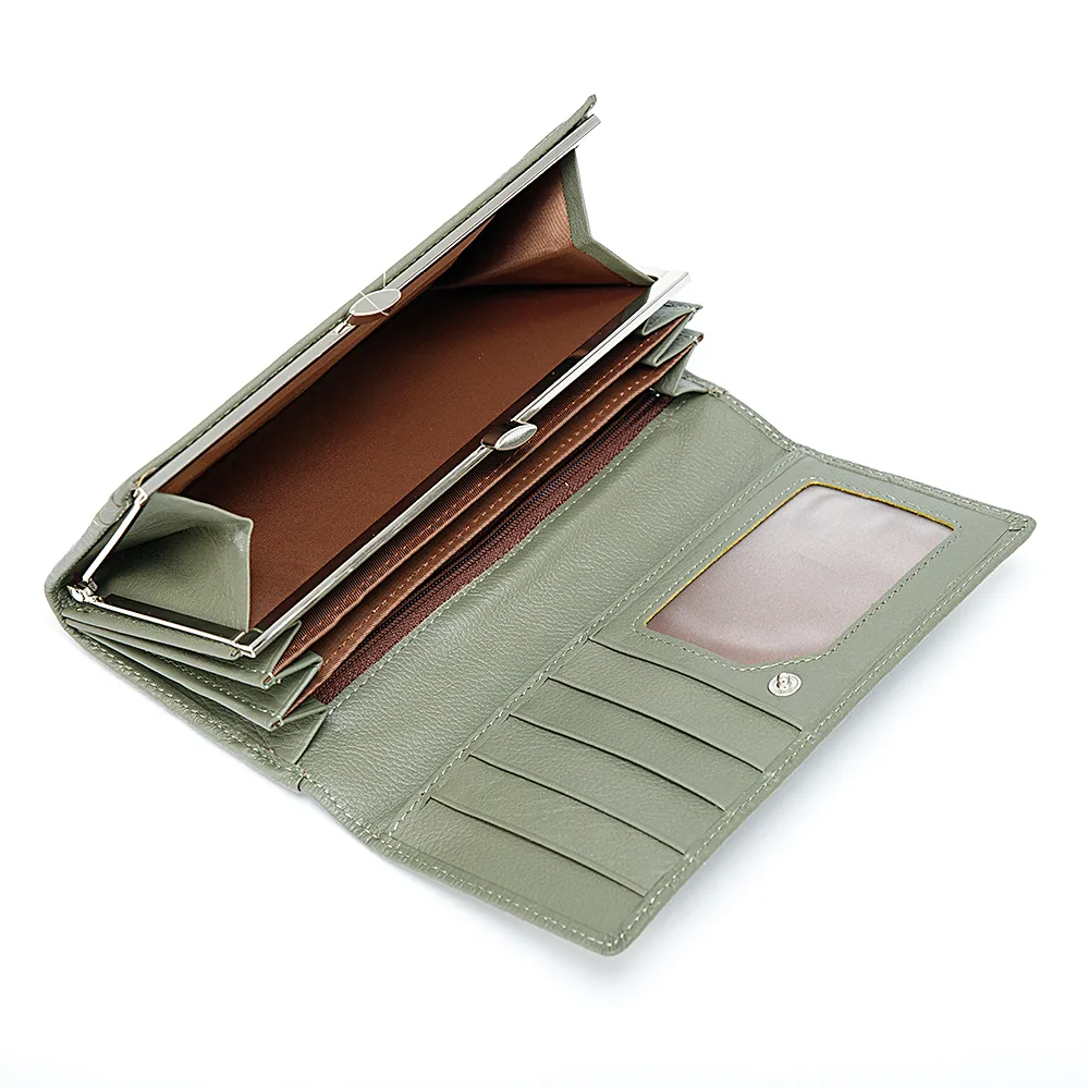 Большой женский кошелёк Poshete пастельного зелёного цвета, выполнен из натуральной матовой кожи с фактурным тиснением. Внутри три отделения для купюр, кармашек на молнии, отделение для монет на металлической застёжке и девять кармашков для карточек. Удобный в использовании, закрывается на кнопку.
