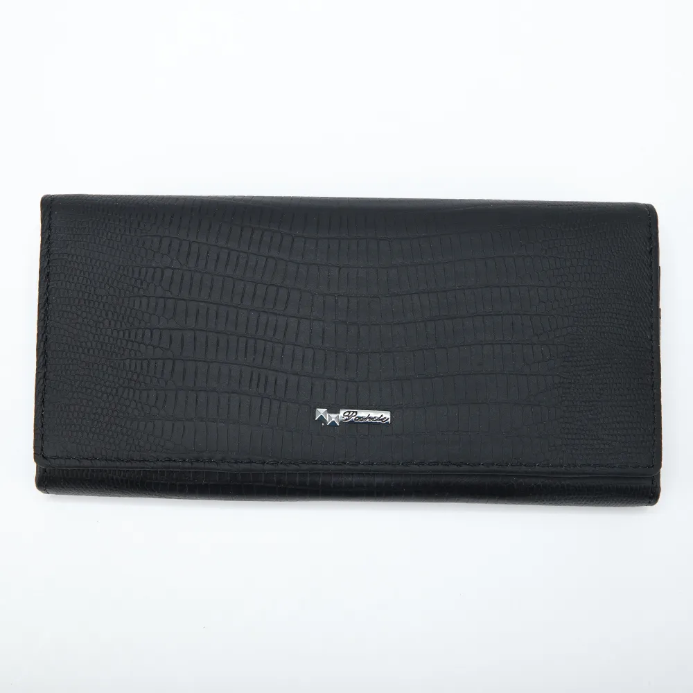 Кошелёк Poshete о котором мечтает ваша сумочка выполнен из натуральной кожи и украшен элегантным тиснением под рептилию. Модель чёрного цвета, классической формы и размера. Снаружи накладной карман без застёжки. Основная часть фиксируется кнопкой. Внутри три отделения для купюр, девять кармашков для карт, одно из которых с окошком, два дополнительных кармана и отделение на замке-поцелуйчике для монет.