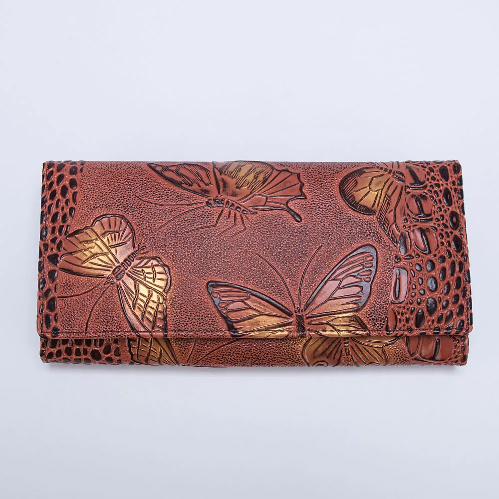 Кошелёк Poshete о котором мечтает ваша сумочка выполнен из натуральной кожи и украшен фактурным тиснением в виде бабочек. Модель коричневого цвета, классической формы и размера. Снаружи накладной карман без застёжки. Основная часть фиксируется кнопкой. Внутри три отделения для купюр, девять кармашков для карт, одно из которых с окошком, два дополнительных кармана и отделение на замке-поцелуйчике для монет.