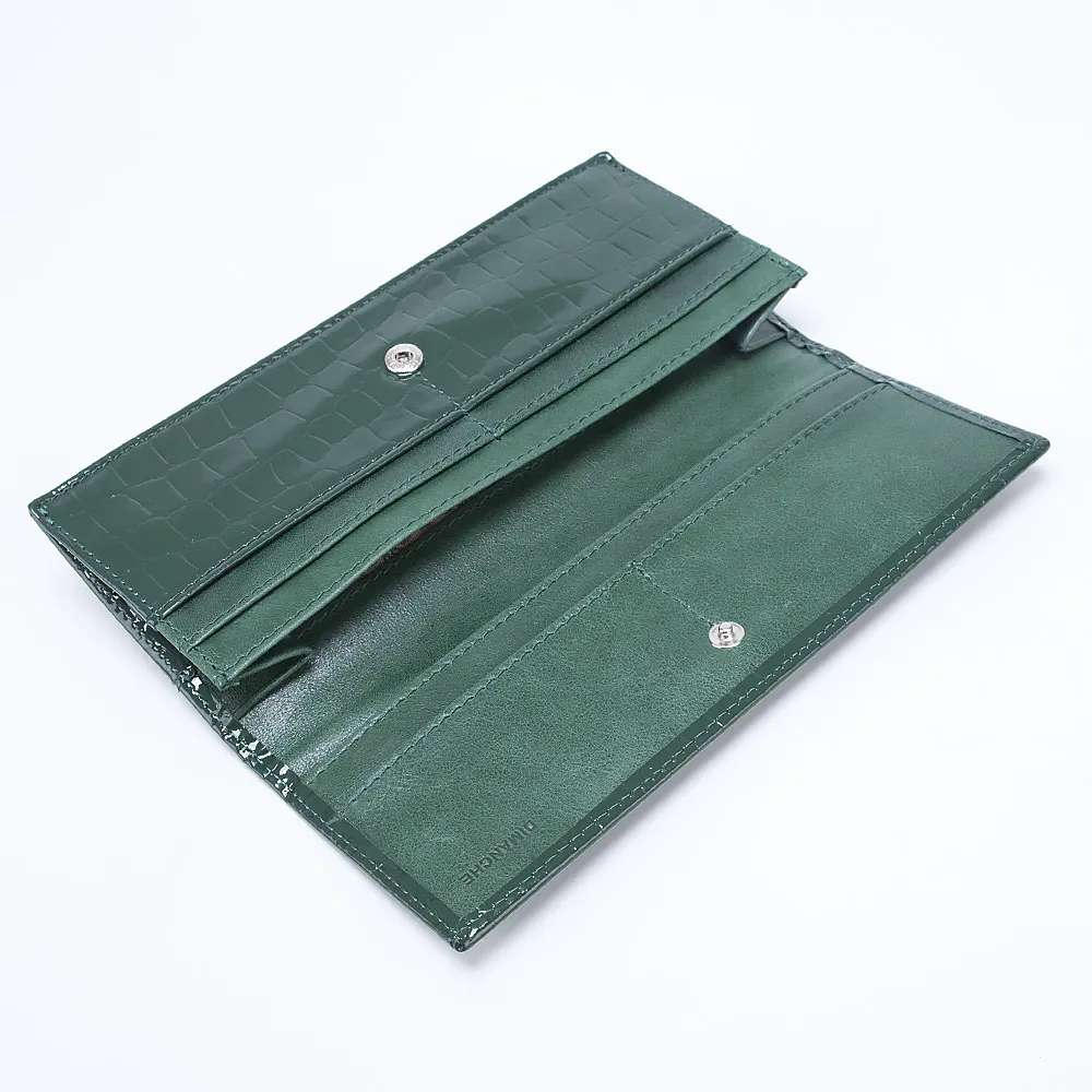 Полноразмерный кошелек от торговой марки Dimanche из натуральной лакированной кожи зеленого цвета с тиснением под крокодиловую кожу. Закрывается клапаном на кнопку. Внутри: отделение для купюр, карманы для карт. На задней стороне - карман для монет на молнии.