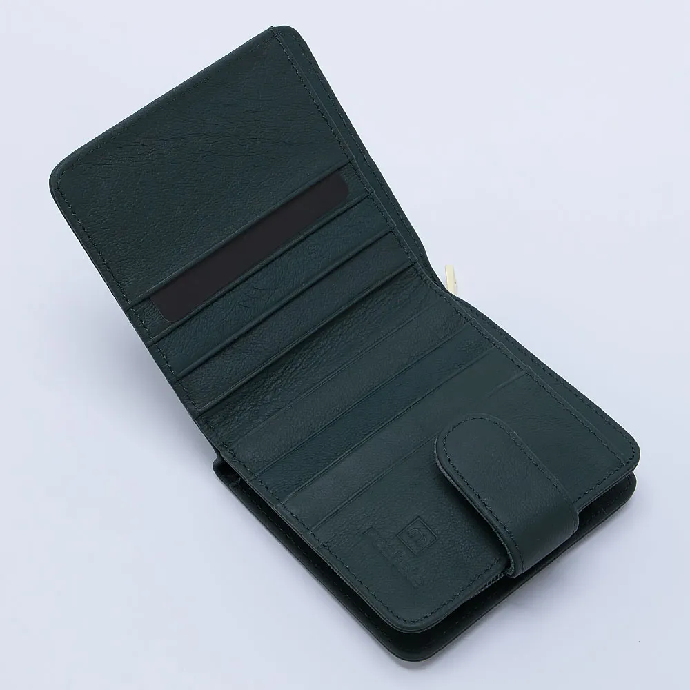 Кошелек от торговой марки Poshete из натуральной кожи зеленого цвета. Модель имеет одно сложение, закрывается хлястиком на кнопке. Внутри: отделение для купюр и карманы для карт. Снаружи имеется отделение для монет на молнии, с внутренней перегородкой.