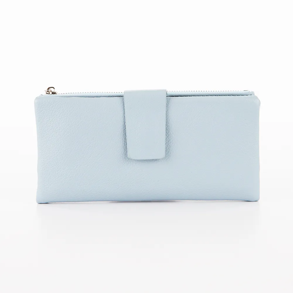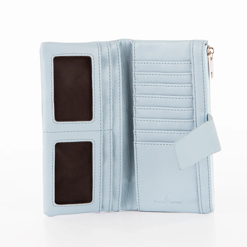 Полноразмерный кошелек от торговой марки Passo Avanti из искусственной кожи голубого цвета. Модель закрывается хлястиком на скрытом магните; раскрывается книжкой. Внутри: карманы для карт, купюр документов, два кармана-окошка. Снаружи – два кармана на молнии.