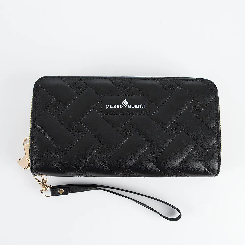 Полноразмерный кошелек от торговой марки Passo Avanti из искусственной кожи черного цвета. Модель со съемным ремешком для запястья. Лицевая сторона декорирована оригинальной узорной стежкой. Два отделения на молнии. Внутри: отделения для купюр, карманы для карт, карман на молнии.