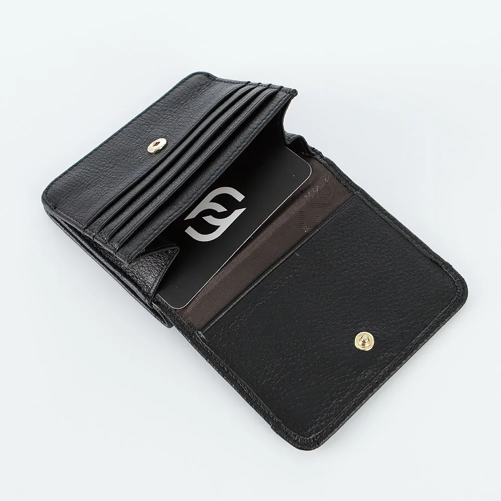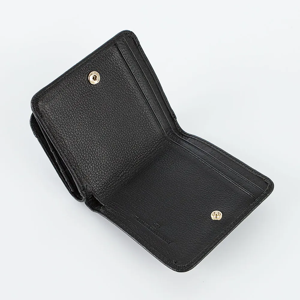 Кошелек от торговой марки Francesco Molinary из натуральной кожи черного цвета. Модель с одним сложением; раскрывается книжкой, фиксируется кнопкой. Внутри: карманы для купюр. На лицевой стороне – отделение с клапаном на кнопке; с карманами для карт внутри.