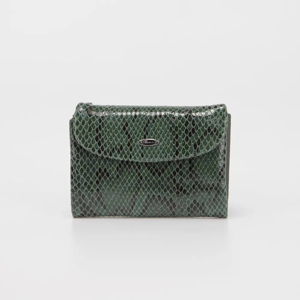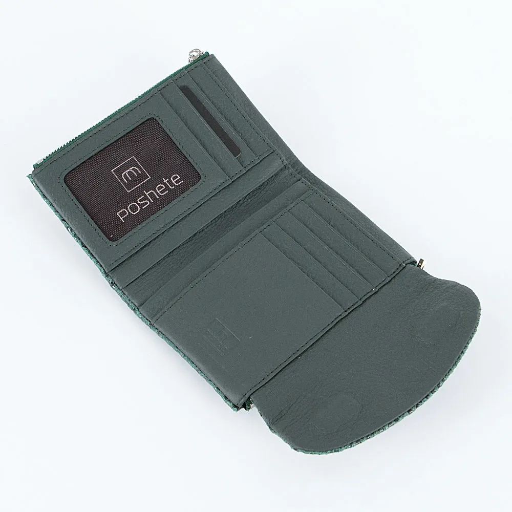Кошелек от торговой марки Poshete изготовлен из натуральной кожи с тиснением под змеиную кожу. Закрывается закругленным клапаном на скрытых магнитах. Модель с одним сложением. Внутри: отделение для купюр, карманы для карт, сетчатый карман-окошко. Имеется два кармана на молнии, один из которых снаружи.