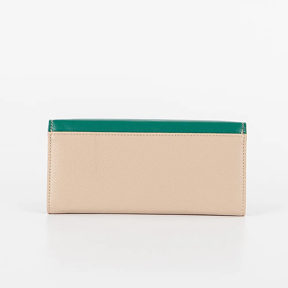 Полноразмерный кошелек от торговой марки Passo Avanti из искусственной кожи в сочетании зеленого и кофейного цвета. Модель закрывается клапаном на скрытых магнитах. Внутри: карманы для купюр, карт, два кармана на молнии.