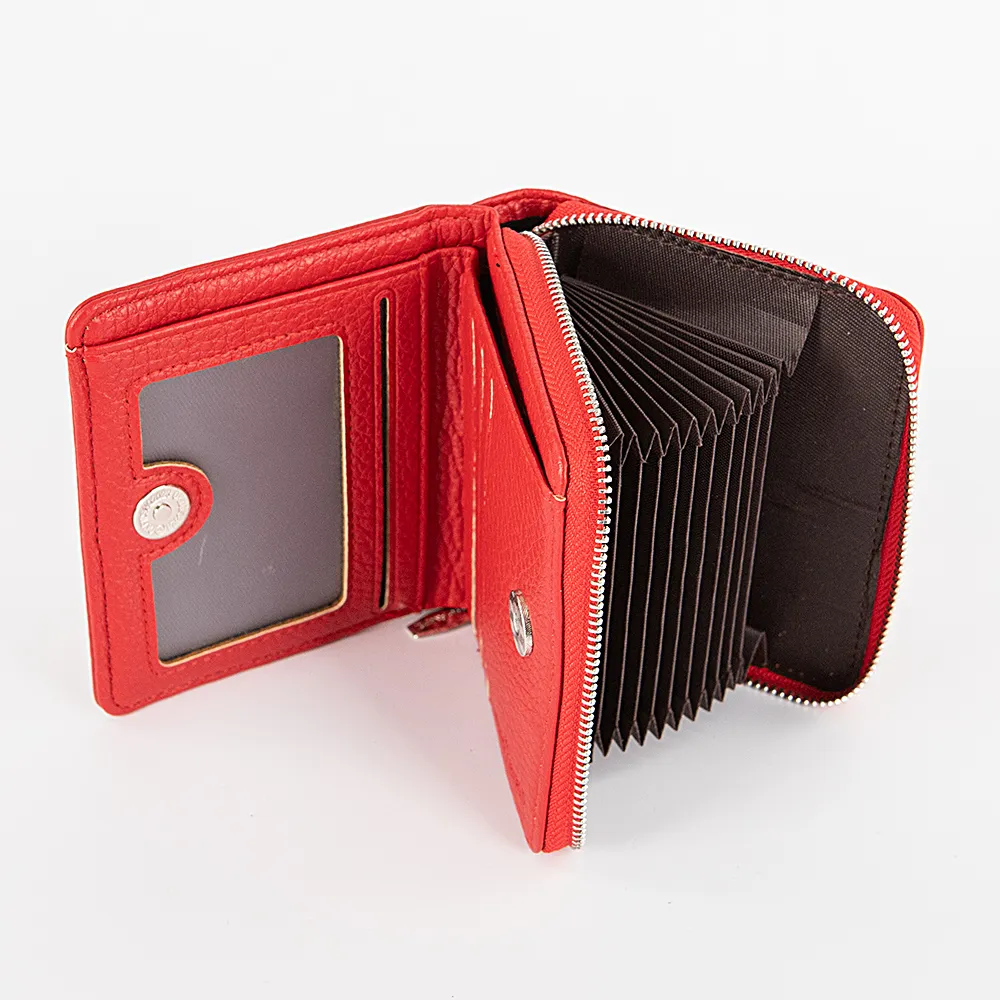 Кошелек от торговой марки Passo Avanti из искусственной кожи красного цвета. Модель с двумя отделениями; имеет одно сложение. В отделении на молнии – блок-гармошка с карманами для карт. Основное отделение фиксируется магнитной кнопкой. Внутри: карманы для карт, карман-окошко, отделение для купюр.
