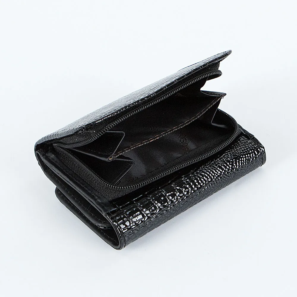 Кошелек от торговой марки Poshete из натуральной лакированной кожи черного цвета с тиснением под рептилию. Модель с двумя сложениями, закрывается клапаном на магните. Внутри: отделение для купюр, карманы для карт, карман-окошко. Снаружи имеется отделение для монет на молнии с перегородкой внутри.