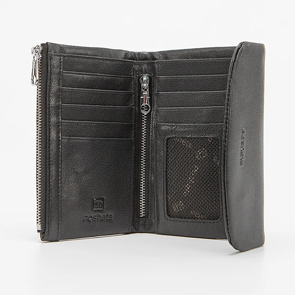Кошелек от торговой марки Poshete из натуральной кожи черного цвета. Закрывается клапаном на скрытых магнитах. Модель с одним сложением; внутри: карманы для карт, карман-окошко, отделение для купюр, карман на молнии. Снаружи имеется монетница на молнии.