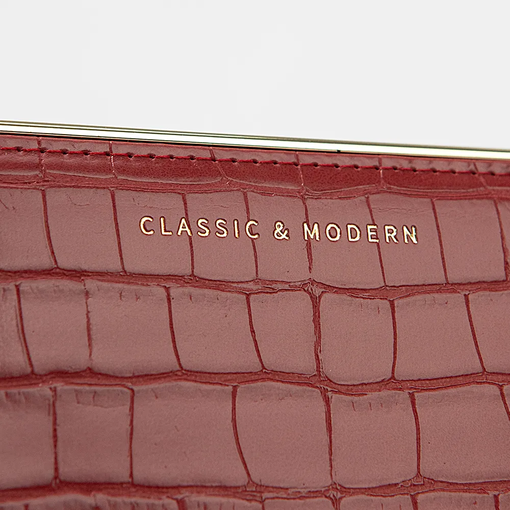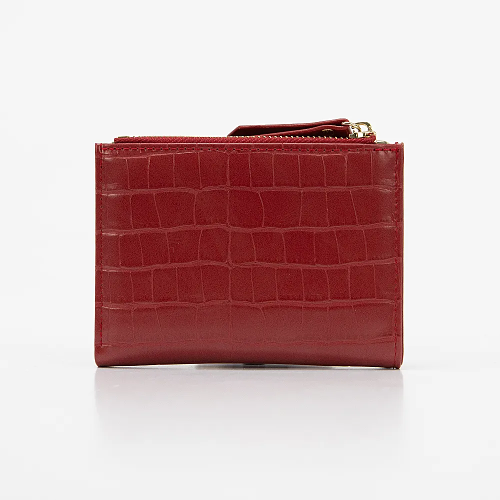 Кошелек от торговой марки Passo Avanti из искусственной кожи красного цвета с тиснением под крокодиловую кожу. Модель раскрывается книжкой, фиксируется кнопкой. Внутри: отделение для купюр, карманы для карт, карман-окошко. Снаружи имеется карман на молнии.