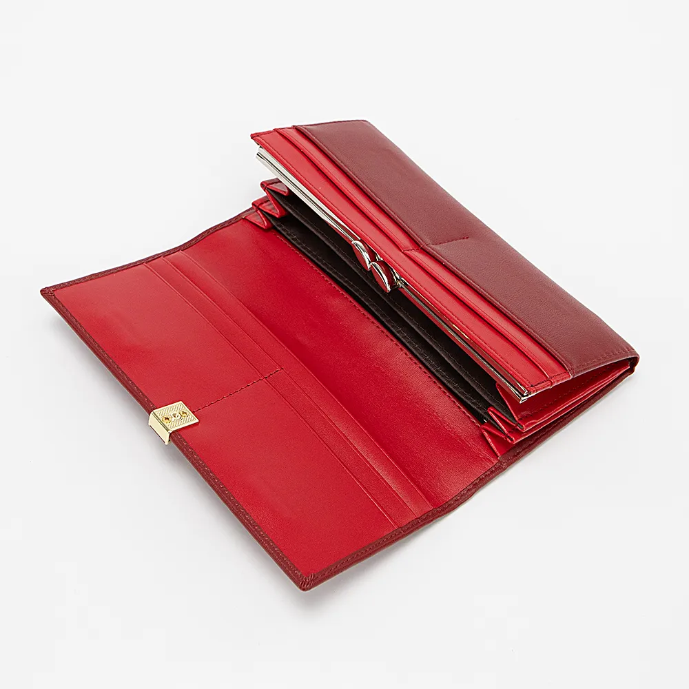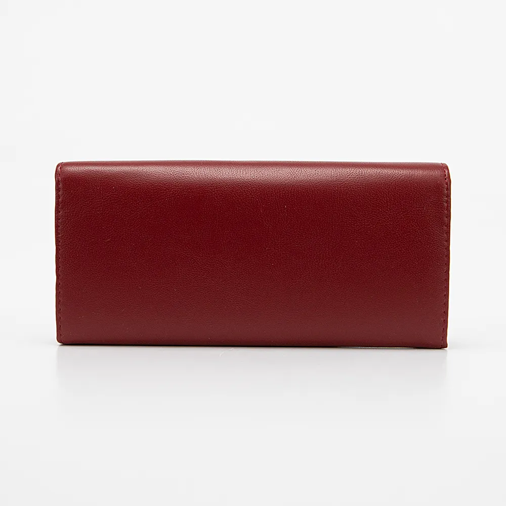 Полноразмерный кошелек от торговой марки Passo Avanti из искусственной кожи бордового цвета. Модель закрывается клапаном на скрытом магните. Внутри: отделения для купюр, отделение для монет с застежкой фермуар, карманы для карт.