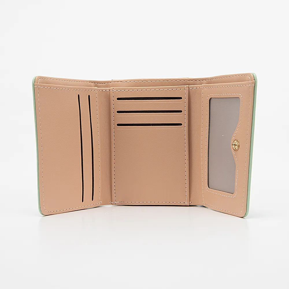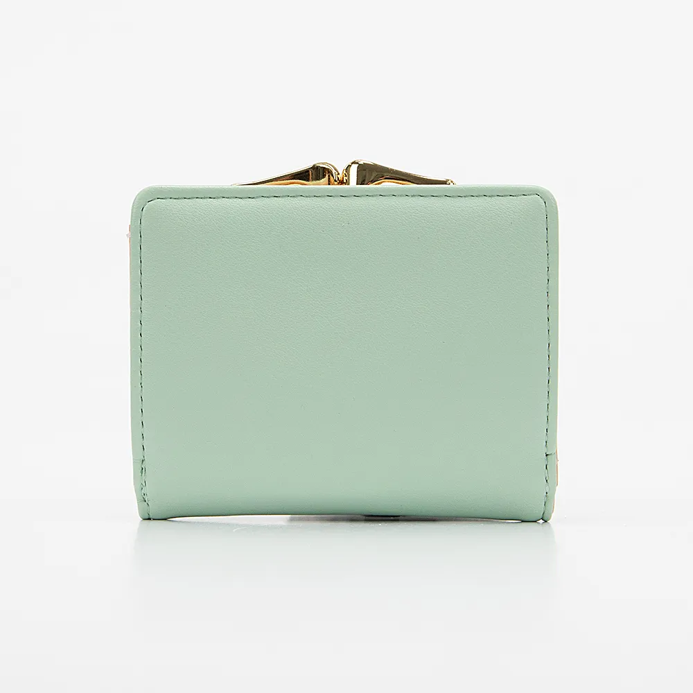 Кошелек от торговой марки Passo Avanti из искусственной кожи зеленого цвета. Модель имеет два сложения; фиксируется кнопкой. Внутри: отделение для купюр, карманы для карт, карман-окошко. Лицевая сторона декорирована принтом с надписью и прорезиненной фигуркой в виде зайчика.
