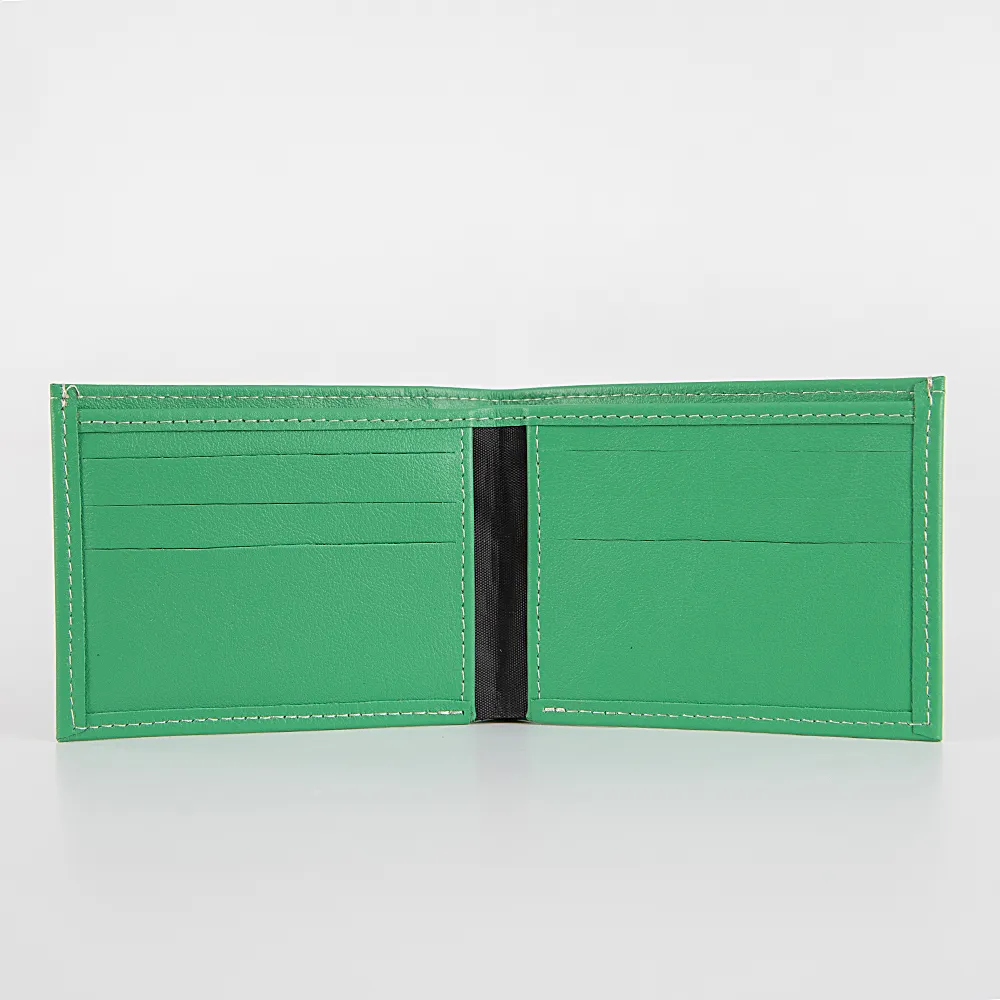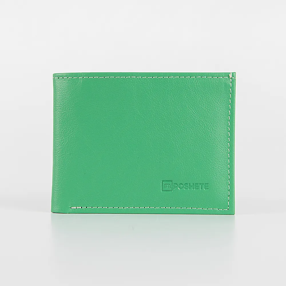 Кошелек от торговой марки Poshete из натуральной кожи зеленого цвета. Модель с одним сложением, раскрывается книжкой. Внутри: отделение для купюр, карманы для карт.