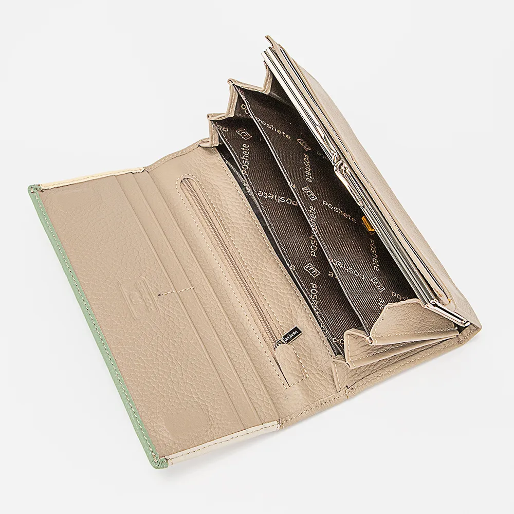 Полноразмерный кошелек от торговой марки Poshete из натуральной кожи. Лицевая сторона декорирована вставками. Закрывается клапаном на скрытых магнитах. Внутри: карманы для карт, карман на молнии, отделение для монет с застежкой фермуар. Снаружи на задней стороне – карман на молнии.