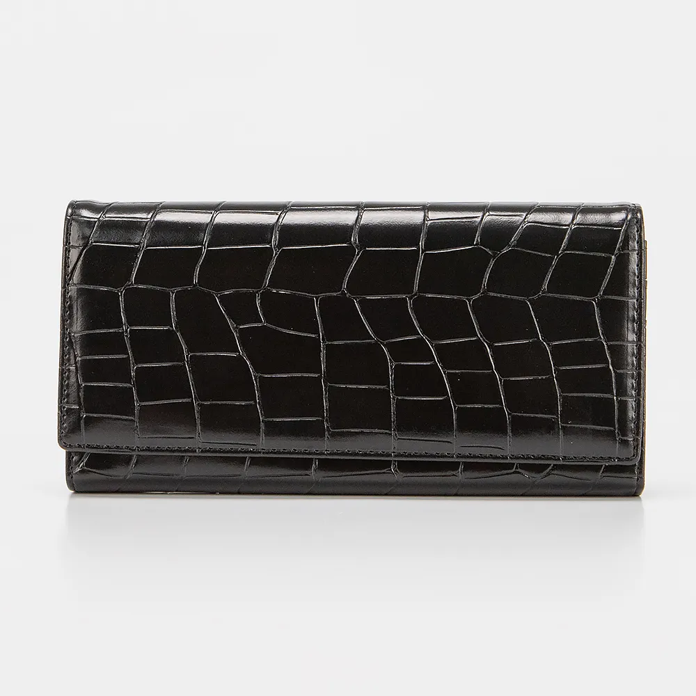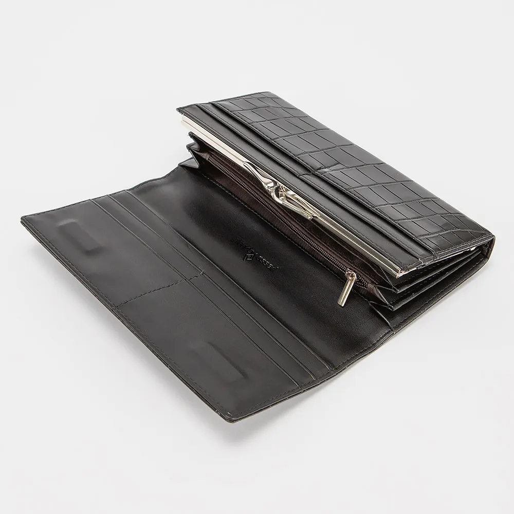 Полноразмерный кошелек от торговой марки Passo Avanti из искусственной кожи с тиснением под рептилию черного цвета. Модель закрывается клапаном на скрытых магнитах. Внутри: карманы для купюр, карт, карман на молнии, отделение для монет с застежкой фермуар.