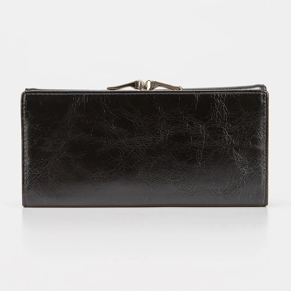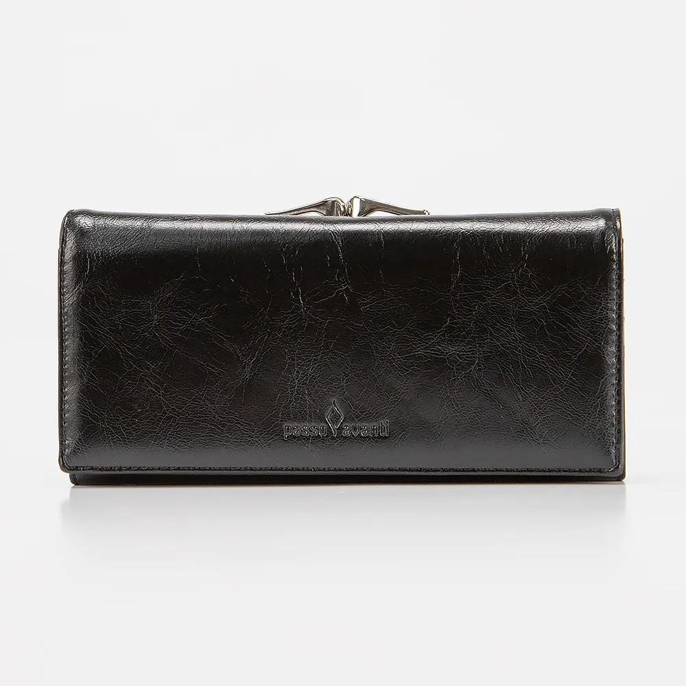 Полноразмерный кошелек от торговой марки Passo Avanti из искусственной кожи черного цвета. Модель закрывается клапаном на скрытых магнитах, имеет одно сложение. Внутри: отделения для купюр и карт, карман на молнии для монет, перегородка. Снаружи – монетница с застежкой фермуар.