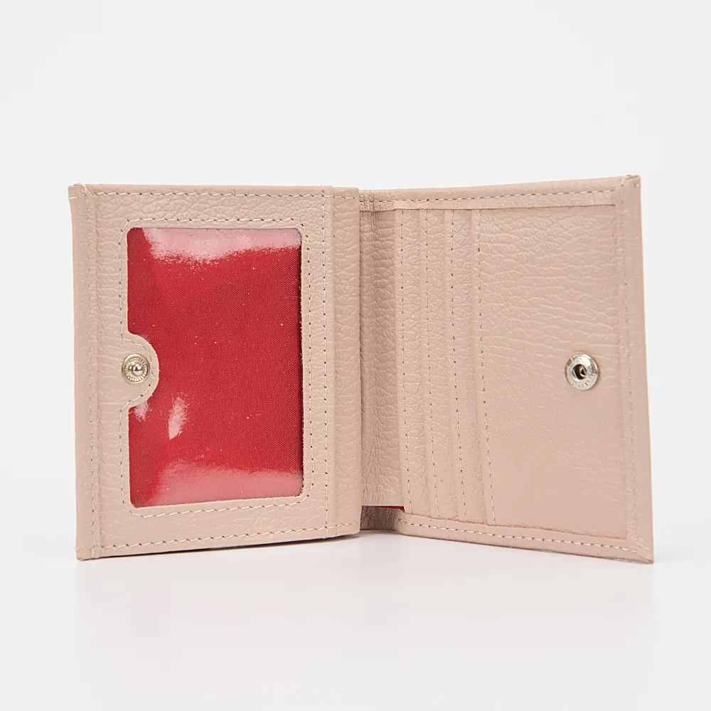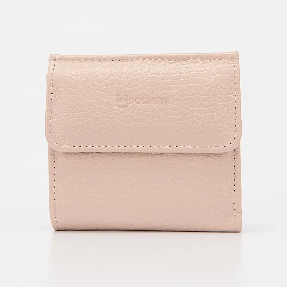Компактный кошелек от торговой марки Poshete из натуральной кожи пудрового цвета. Модель имеет одно сложение; раскрывается книжкой, фиксируется кнопкой. Внутри: карманы для карт, карман-окошко; отделение для купюр с перегородкой. Снаружи имеется карман для монет на молнии.