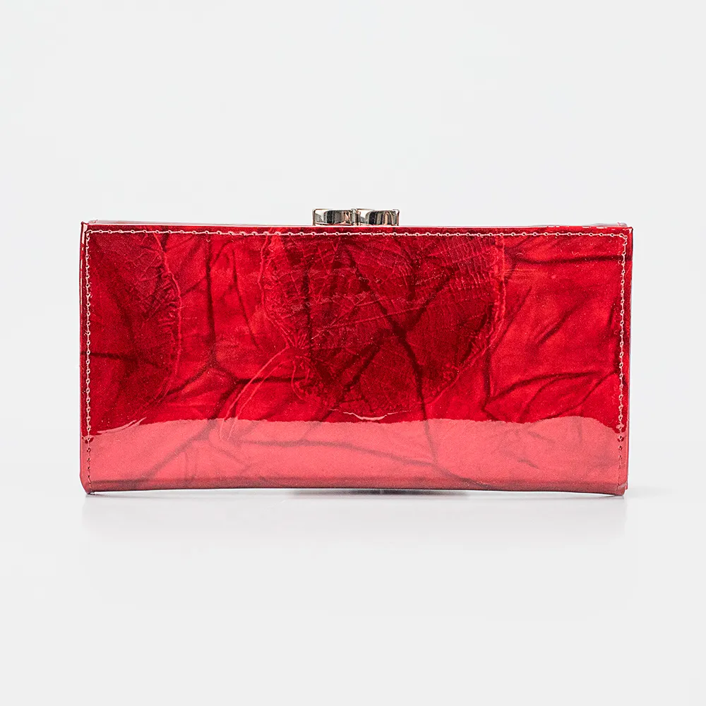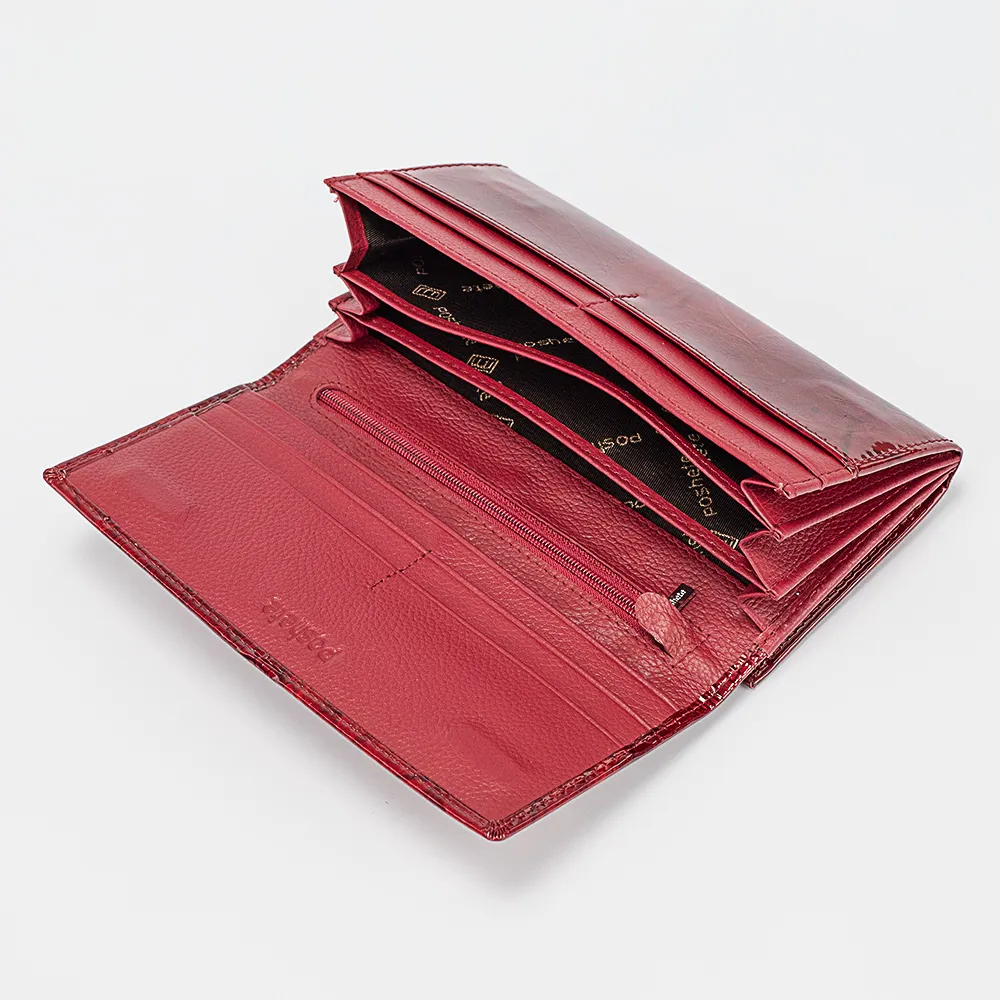 Полноразмерный кошелёк от торговой марки Poshete тёмно-красного цвета выполнен из натуральной лакированной кожи красного цвета с тиснением в виде листьев. Закрывается клапаном на кнопку. Внутри: три отделения для купюр, карман на молнии, карманы для карт. Снаружи – монетница с застежкой фермуар.