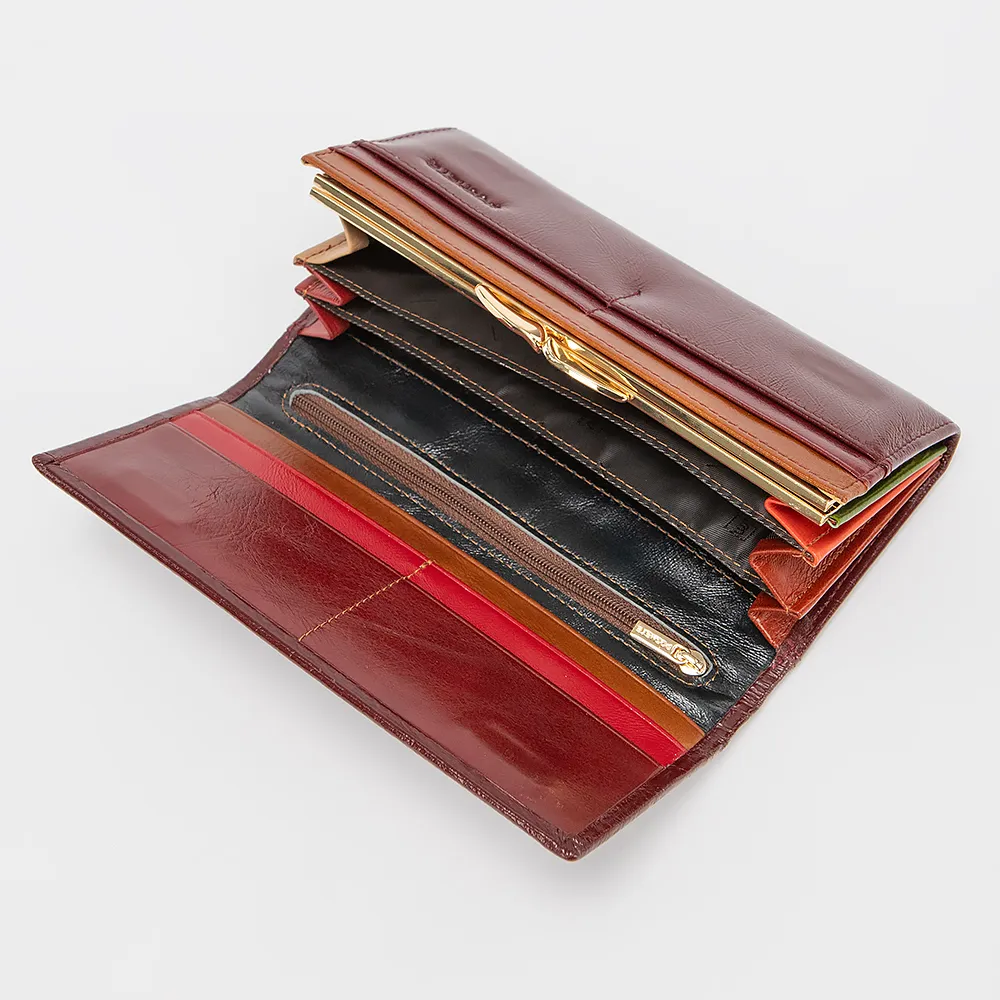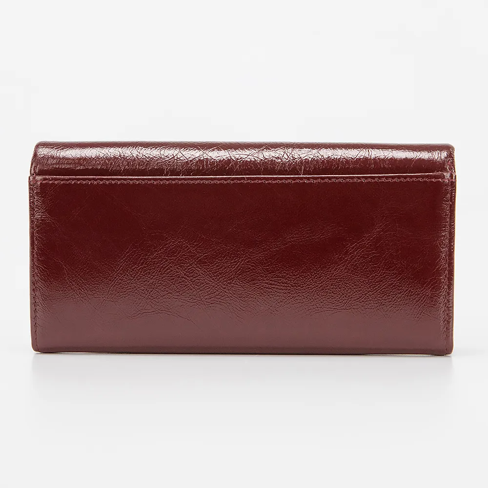 Полноразмерный кошелек от торговой марки Poshete из натуральной кожи бордового цвета. Закрывается клапаном на скрытых магнитах. Внутри: карманы для карт, отделение для купюр с двумя перегородками, монетница с застежкой фермуар, карман на молнии. Снаружи имеется накладной карман.