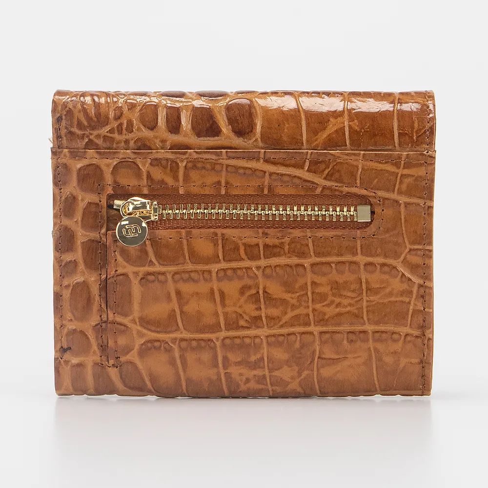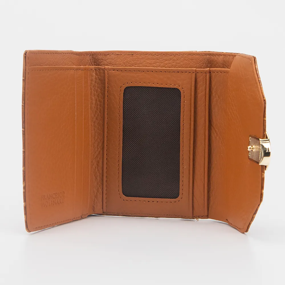 Кошелек от торговой марки Francesco Molinary из натуральной кожи коричневого цвета с тиснением под рептилию. Модель среднего размера,закрывается клапаном на кнопке, раскрывается книжкой. Внутри: карманы для карт, карман-окошко, отделение для купюр. Сзади карман на молнии для монет.