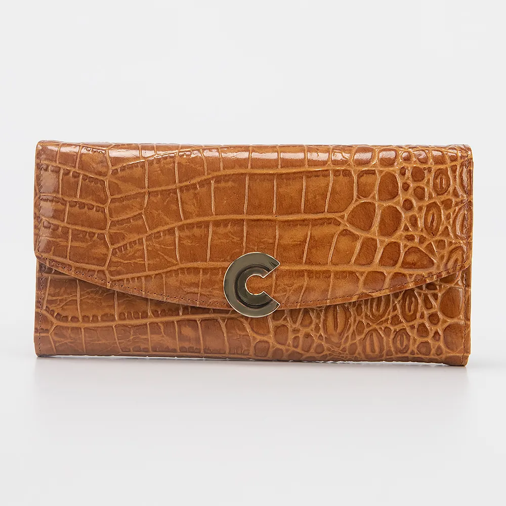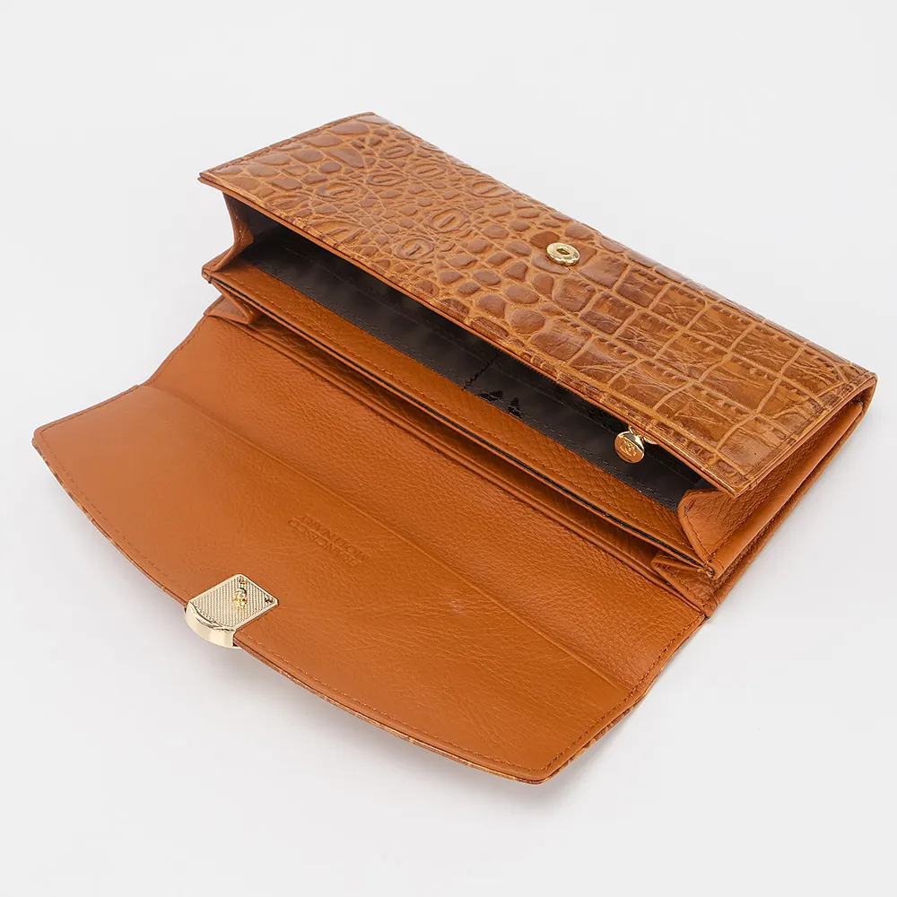Полноразмерный кошелек от торговой марки Francesco Molinary из натуральной кожи коричневого цвета с тиснением под рептилию. Закрывается клапаном на кнопке. Внутри: карманы для карт, отделение для купюр, карман на молнии. Сзади карман на молнии для монет.