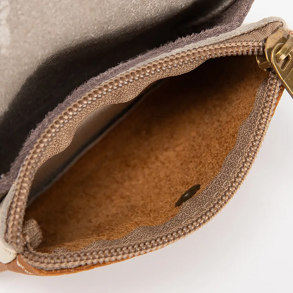 Кошелек от торговой марки Poshete выполнен из натуральной кожи в сочетании бежевого и оранжевого цвета. Модель застегивается клапаном на кнопке. Внутри - отделение на молнии для монет и отделение для купюр в сложенном виде.