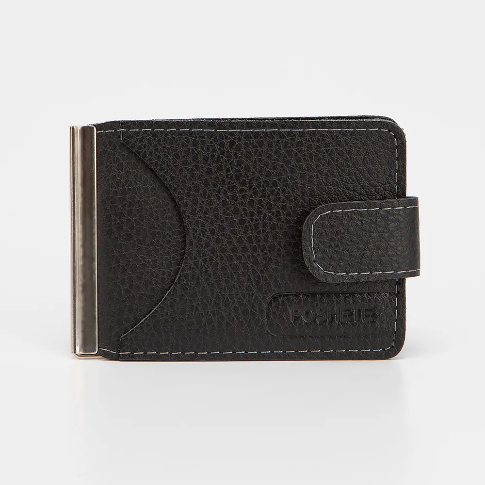 Зажим для денег от торговой марки Poshete из натуральной кожи черного цвета. Модель закрывается хлястиком на кнопку. Раскрывается книжкой. Внутри: металлическая скрепка-зажим для купюр, карманы для карт. На задней стороне - карман для карты.