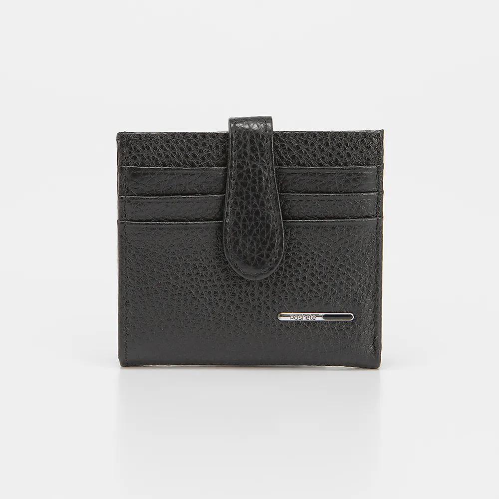 Кошелек от торговой марки Poshete из натуральной кожи черного цвета. Закрывается хлястиком на кнопку, раскрывается книжкой. Внутри: отделение для купюр, карманы для карт. На лицевой стороне снаружи - три кармана для карт. На задней стороне - карман на молнии для монет.