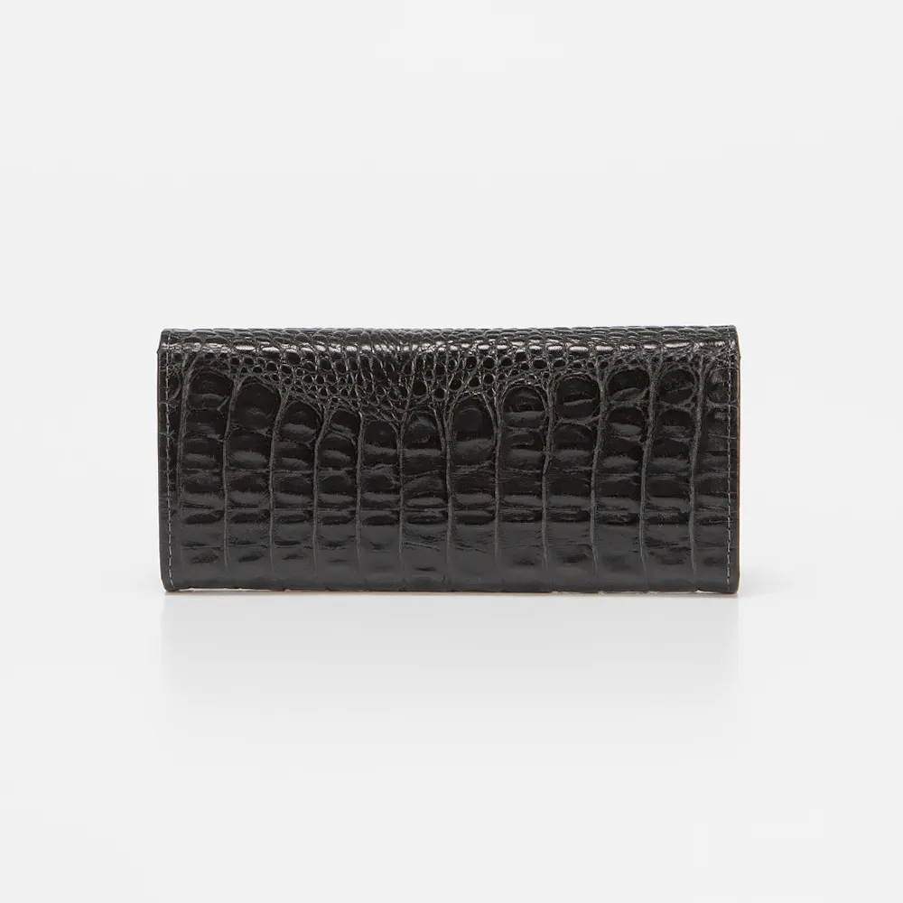 Стильный женский кошелек от бренда Francesco Molinary выполнен из натуральной кожи черного цвета с тиснением под рептилию. Внутри несколько отделений для купюр, карман для монет на кнопке, прорези для пластиковых карт и дополнительный прорезной карман на молнии. Аксессуар с застежкой на металлическую кнопку.