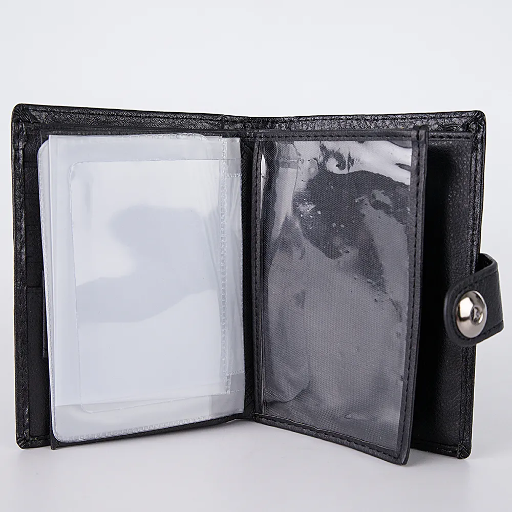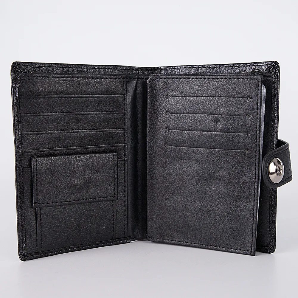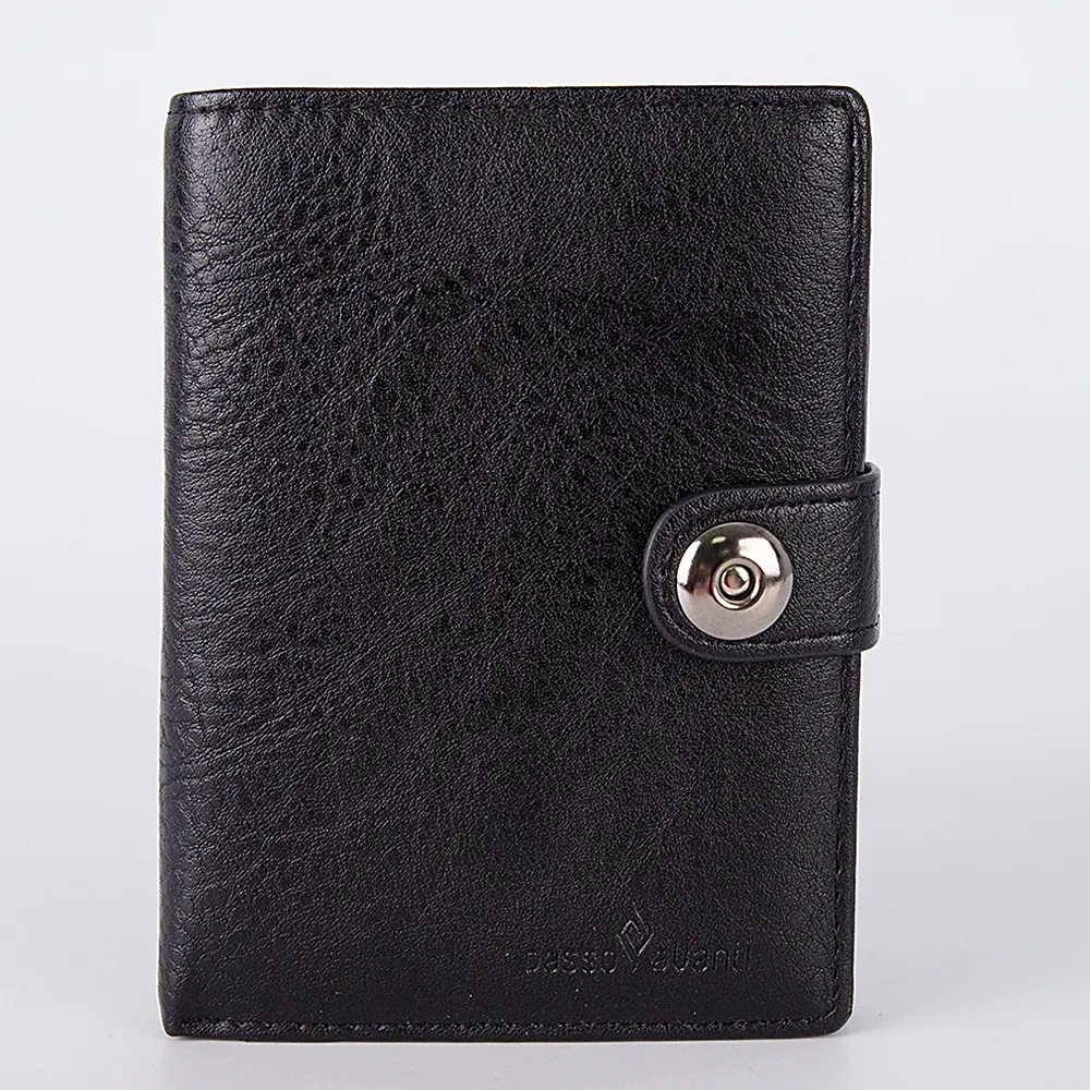 Бумажник для автодокументов и паспорта от бренда Passo Avanti выполнен из искусственной кожи черного цвета. Модель вертикальной ориентации, закрывается кнопкой на хлястике, раскрывается книжкой. Внутри: две перегородки, карманы для карт, карман на кнопке, прозрачные файлы для автодокументов, отделение с клапанами для паспорта.