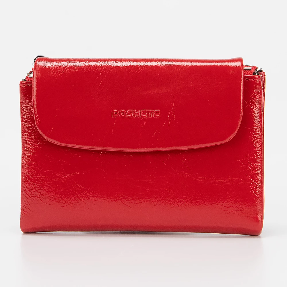 Кошелек от бренда Poshete из натуральной кожи красного цвета. Модель закрывается на кнопку, имеет одно сложение. Внутри: карман на молнии, карман для купюр, карман-окошко, карманы для карт из кожи разных цветов. Снаружи — карман на молнии.