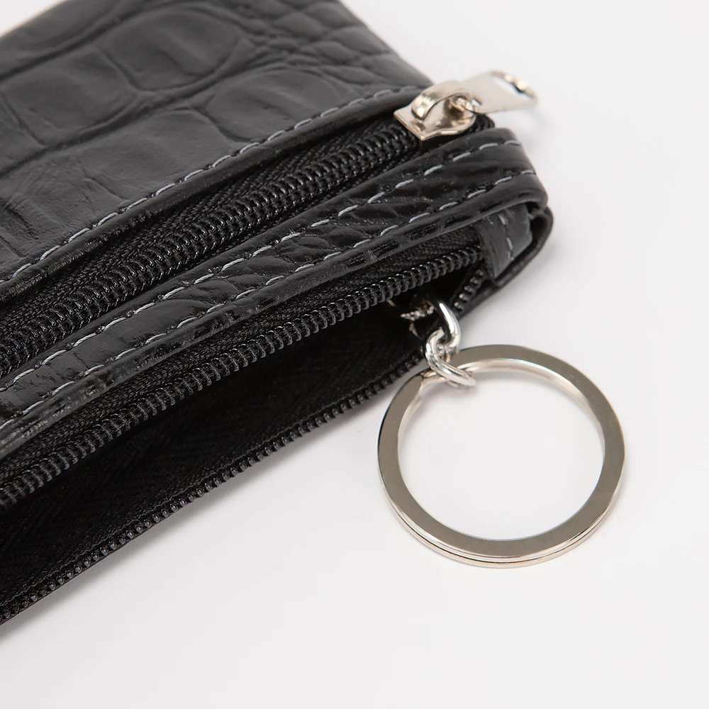 Ключница от бренда Valigetti выполнена из натуральной кожи черного цвета с тиснением под крокодила. Отделение на молнии. Внутри: кольцо для крепления. Снаружи имеется карман на молнии.