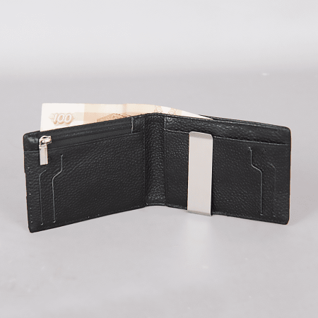 Удобный зажим для денег бренда Valigetti изготовлен из искусственной кожи в черном цвете. На лицевой стороне находится открытый карман для пластиковых карт, а сам зажим складывается в виде книжки. Внутри расположено семь карманов для пластиковых карт, один карман на молнии и специальный карман для купюр. Дополнительным преимуществом является наличие металлического зажима для денег.