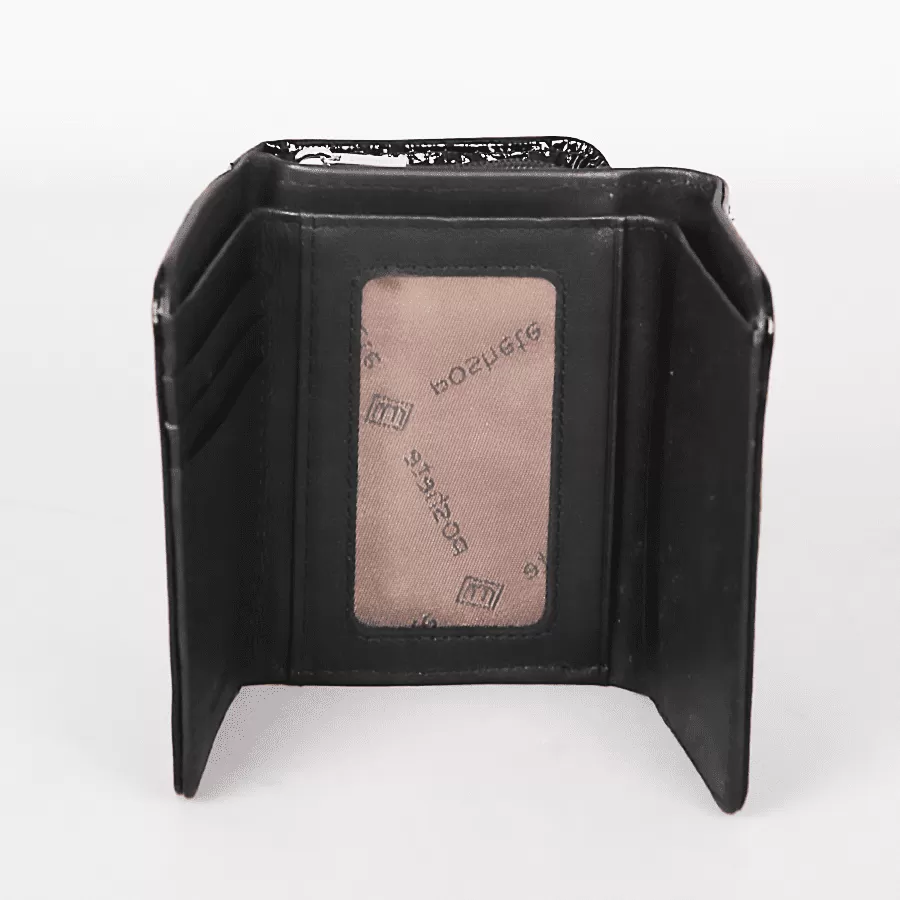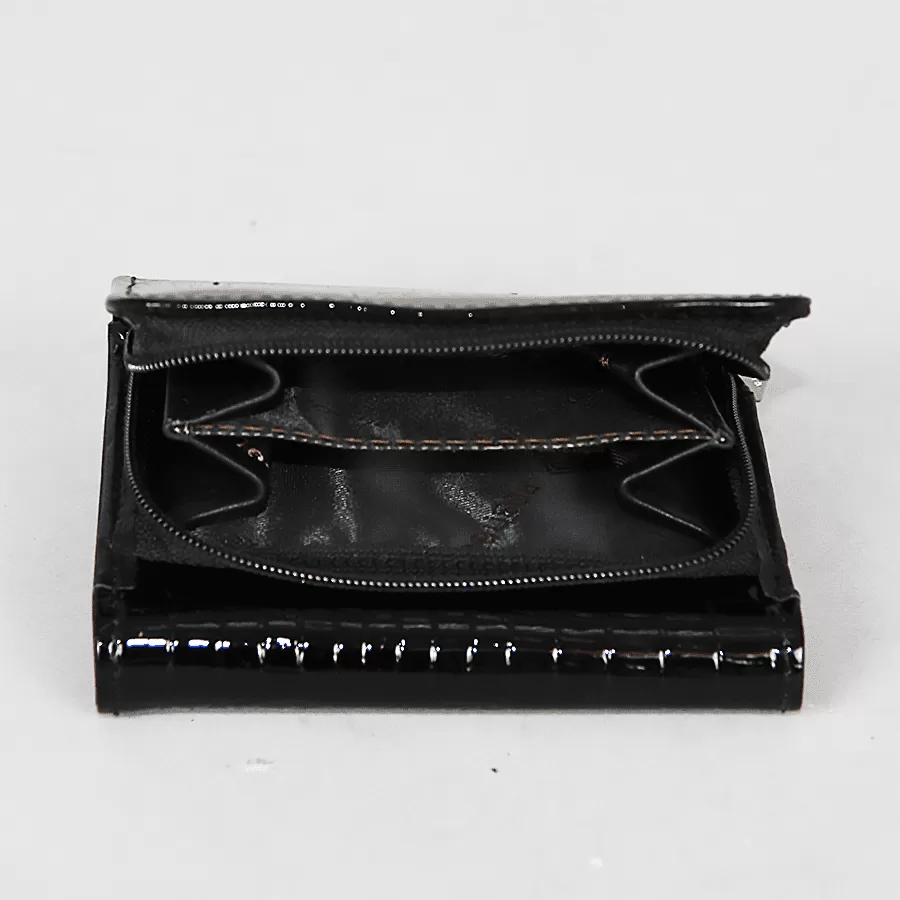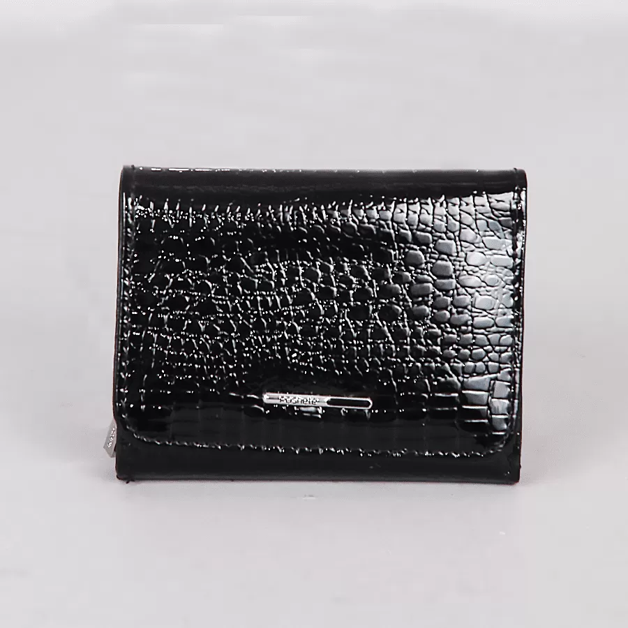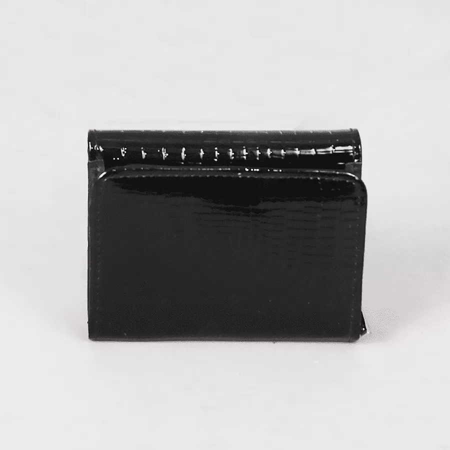Кошелек бренда Poshete из натуральной лакированной кожи черного цвета с тиснением под рептилию. Он имеет два сложения и закрывается клапаном на магните. Внутри есть отделение для купюр, карманы для карт и карман-окошко. Снаружи находится отделение для монет на молнии с перегородкой внутри.