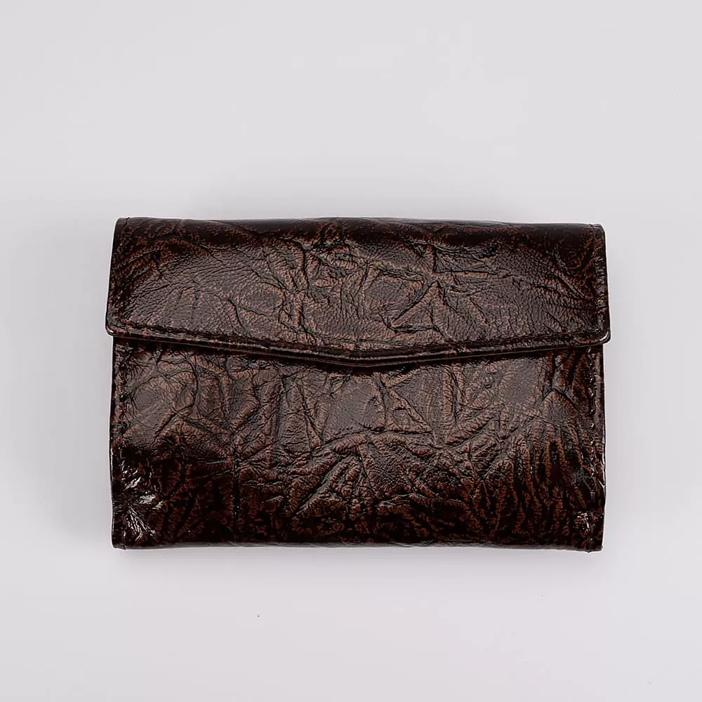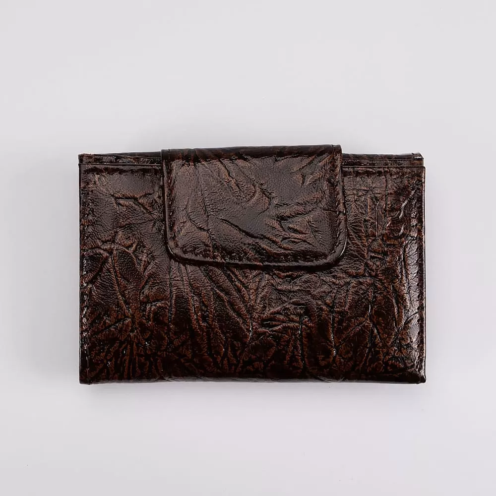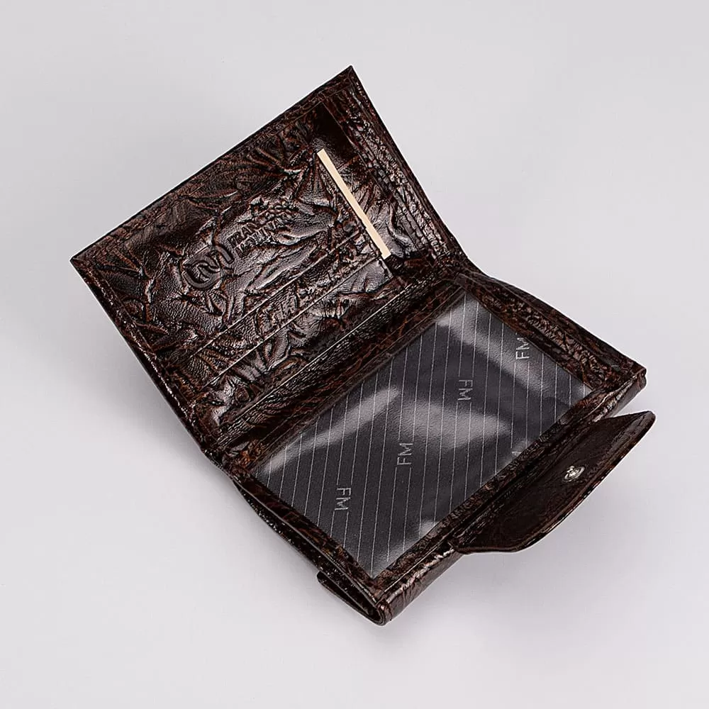 Кошелек бренда Francesco Molinary, изготовленный из натуральной кожи коричневого цвета, имеет оригинальное тиснение. Он закрывается узким клапаном на кнопке и имеет одно сложение, раскрываясь как книжка. Внутри есть отделение для купюр, карманы для карт и карман-окошко. Снаружи имеется отделение для монет с клапаном на кнопке. Внутри также есть средник на молнии.