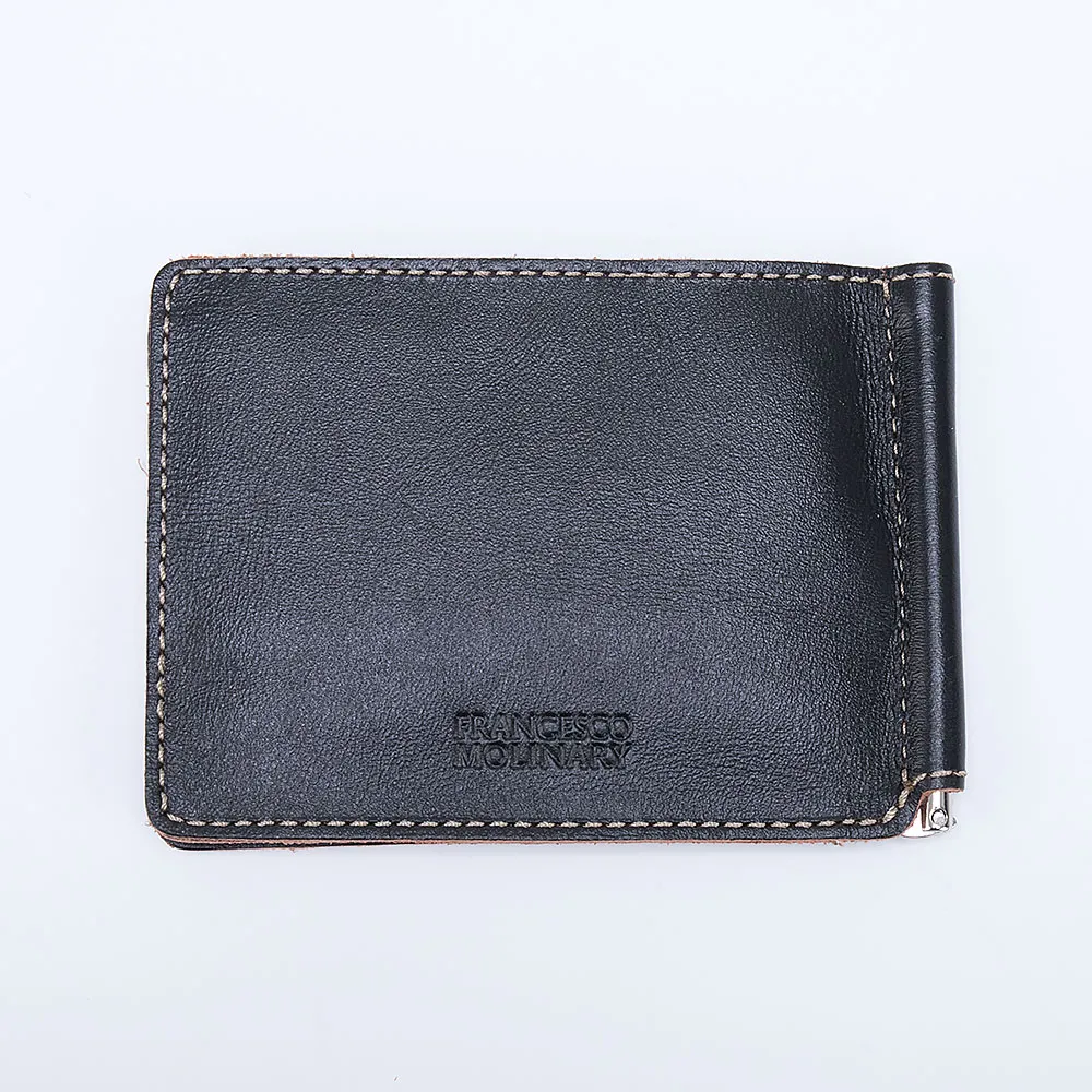 Классический зажим для денег от бренда Francesco Molinary. Модель выполнена из натуральной гладкой кожи классического черного цвета дополнена серебристой металлической фурнитурой и украшена декоративным тиснением.
